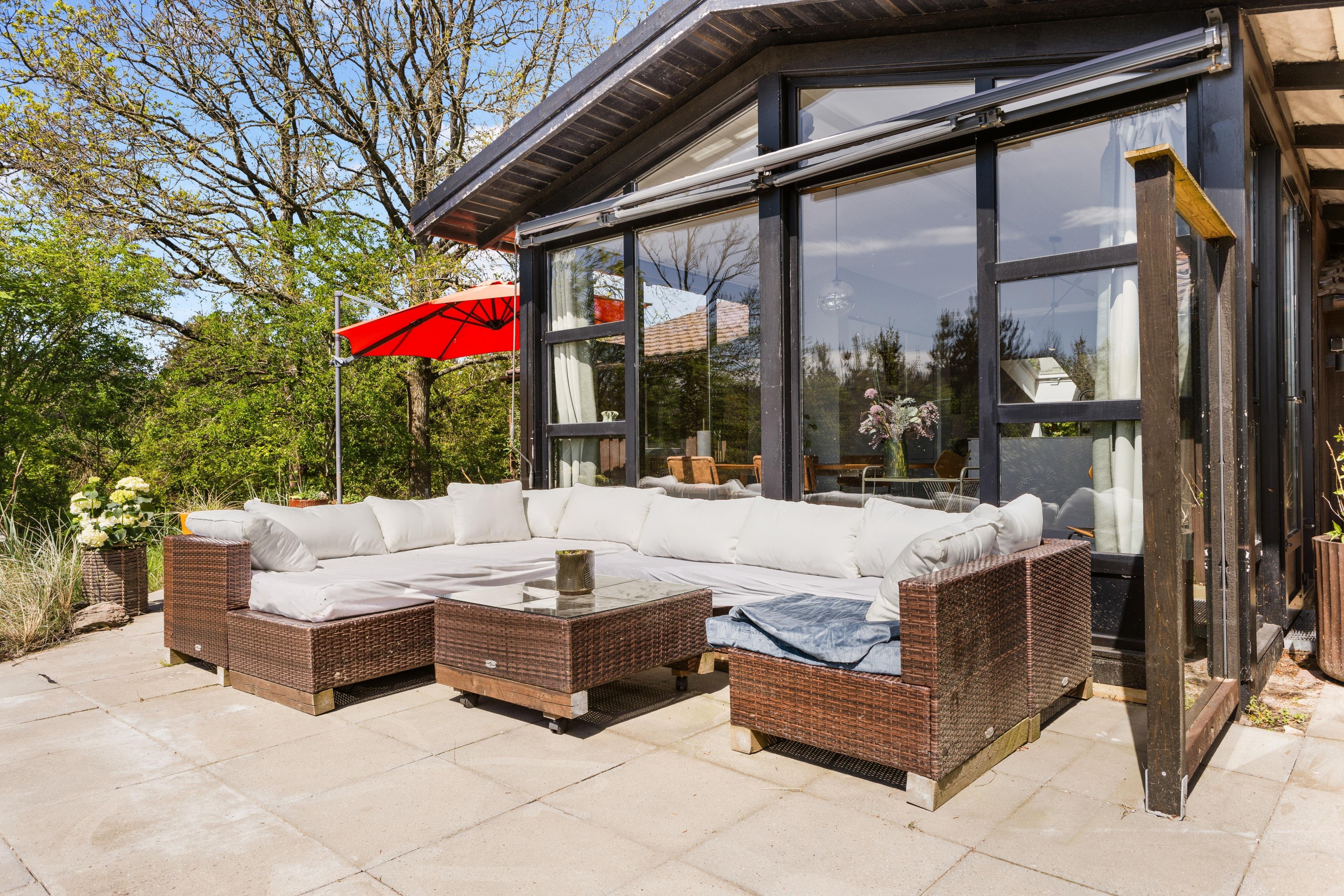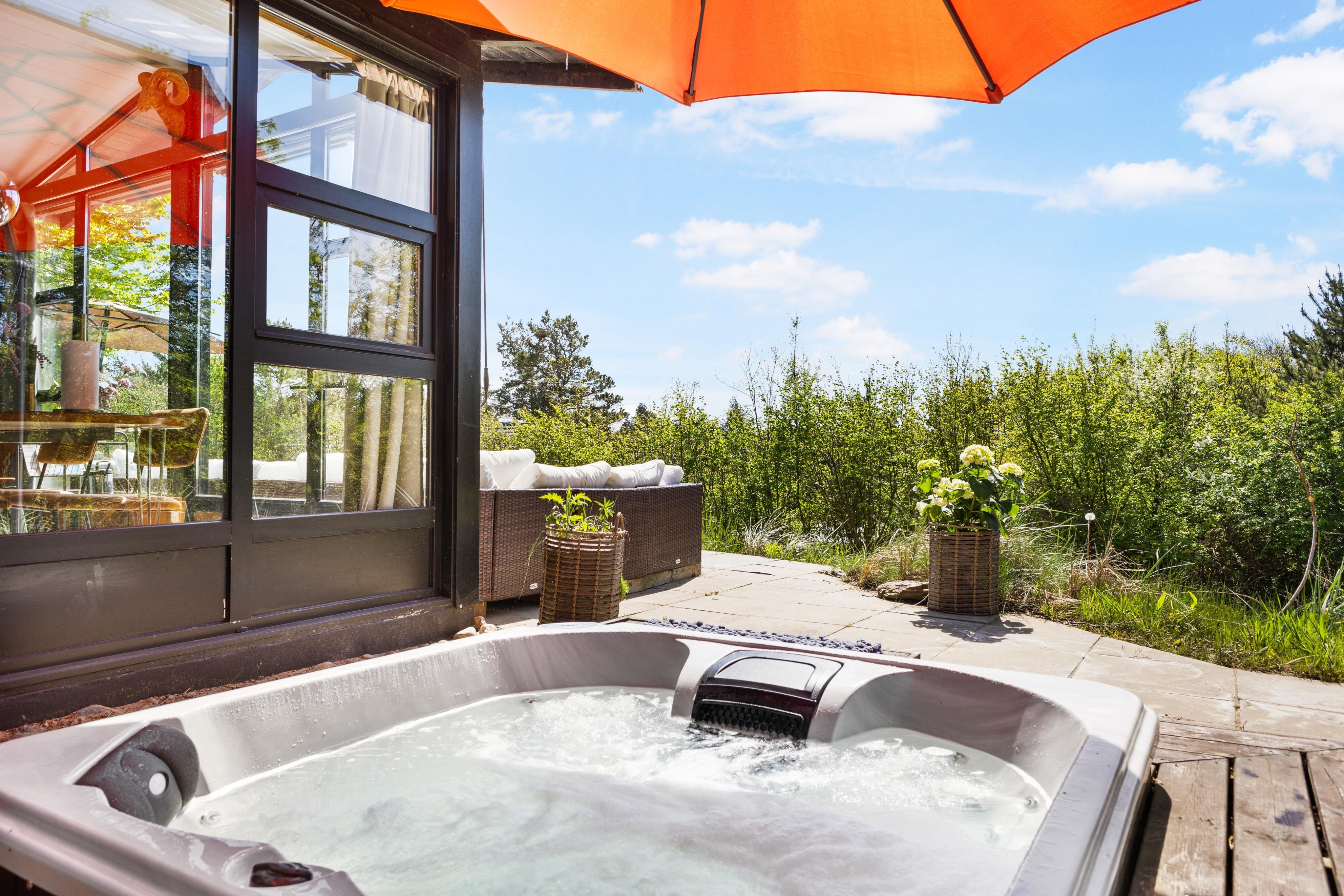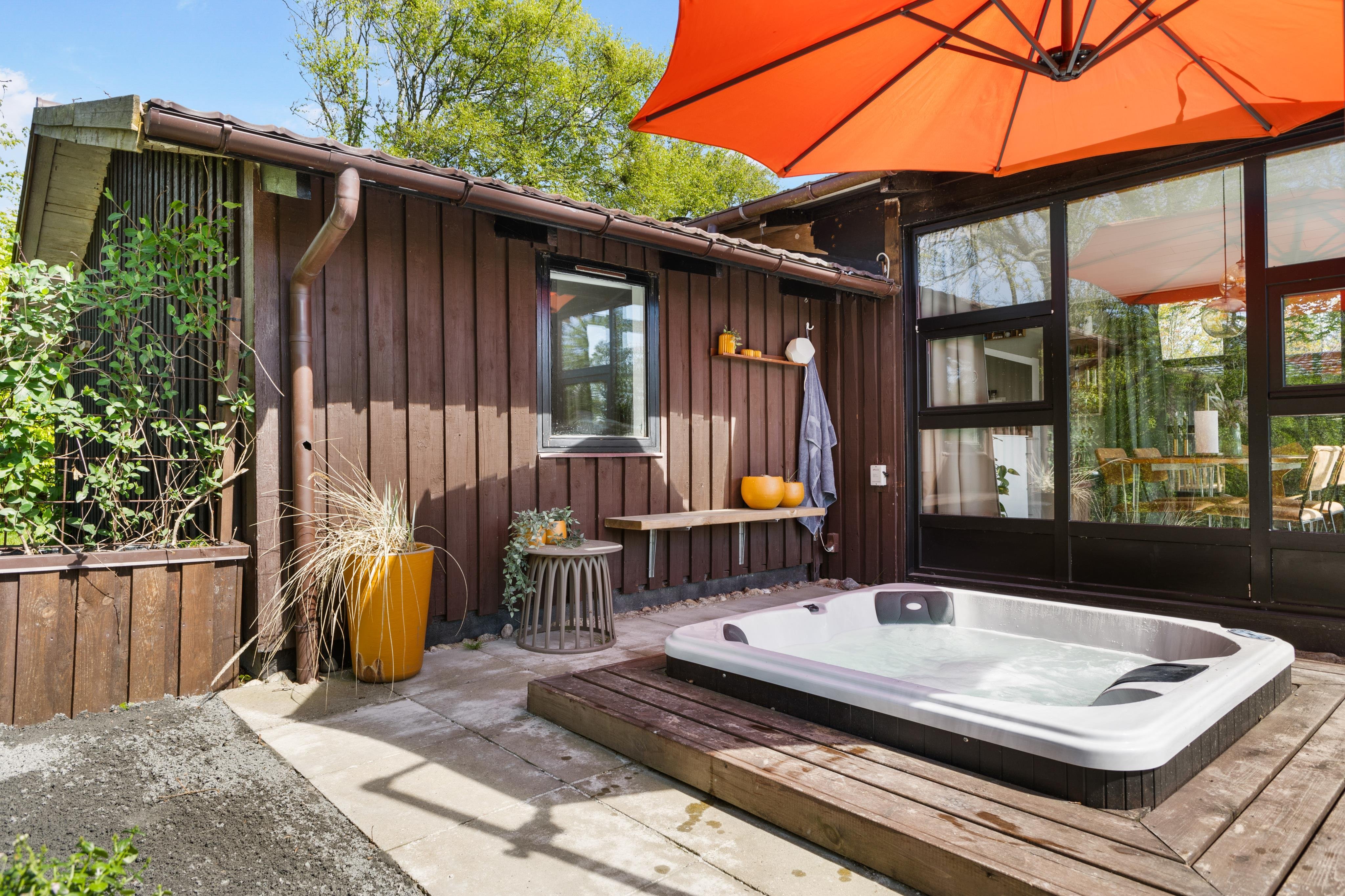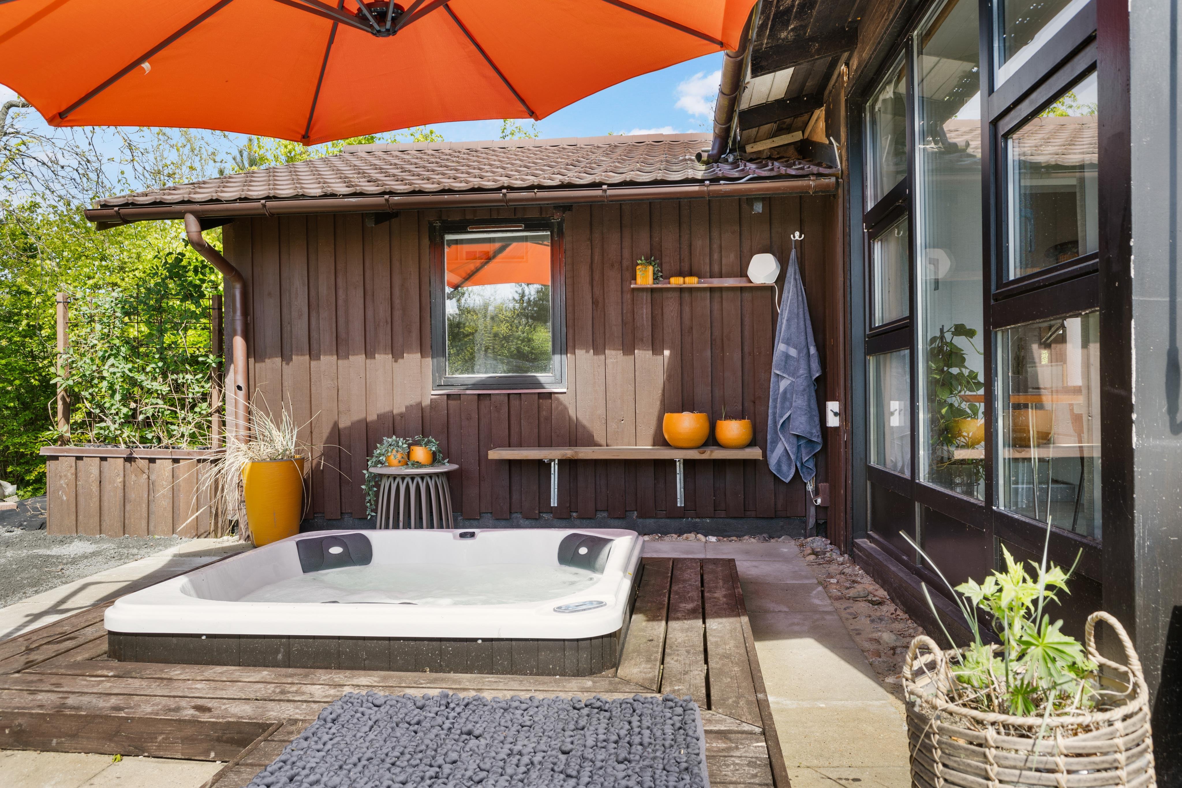 Udenfor huset er stort terrasseområde med udespa og grill - så her kan man benytte mange timer og nyde den danske sommer enten ved loungeområdet, i de bløde sofaer, i hyggestolene eller ved spisepladsen.