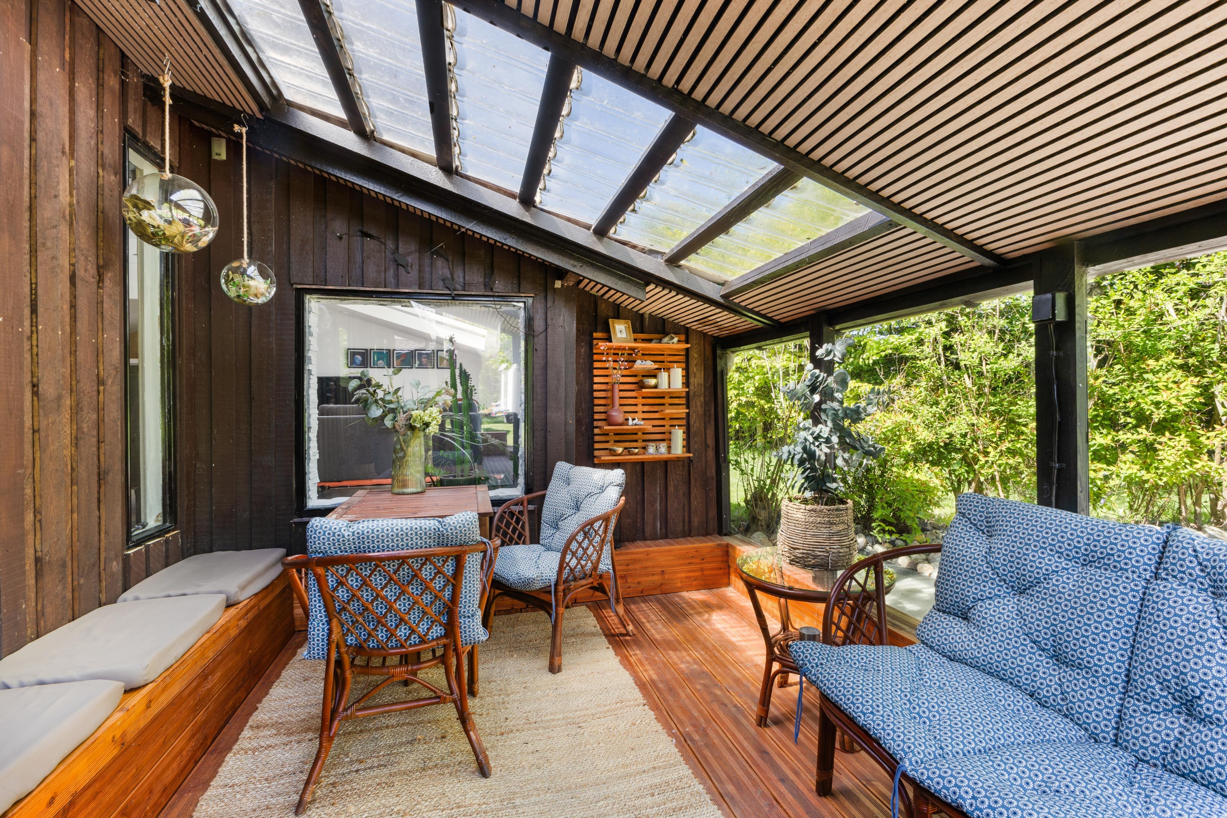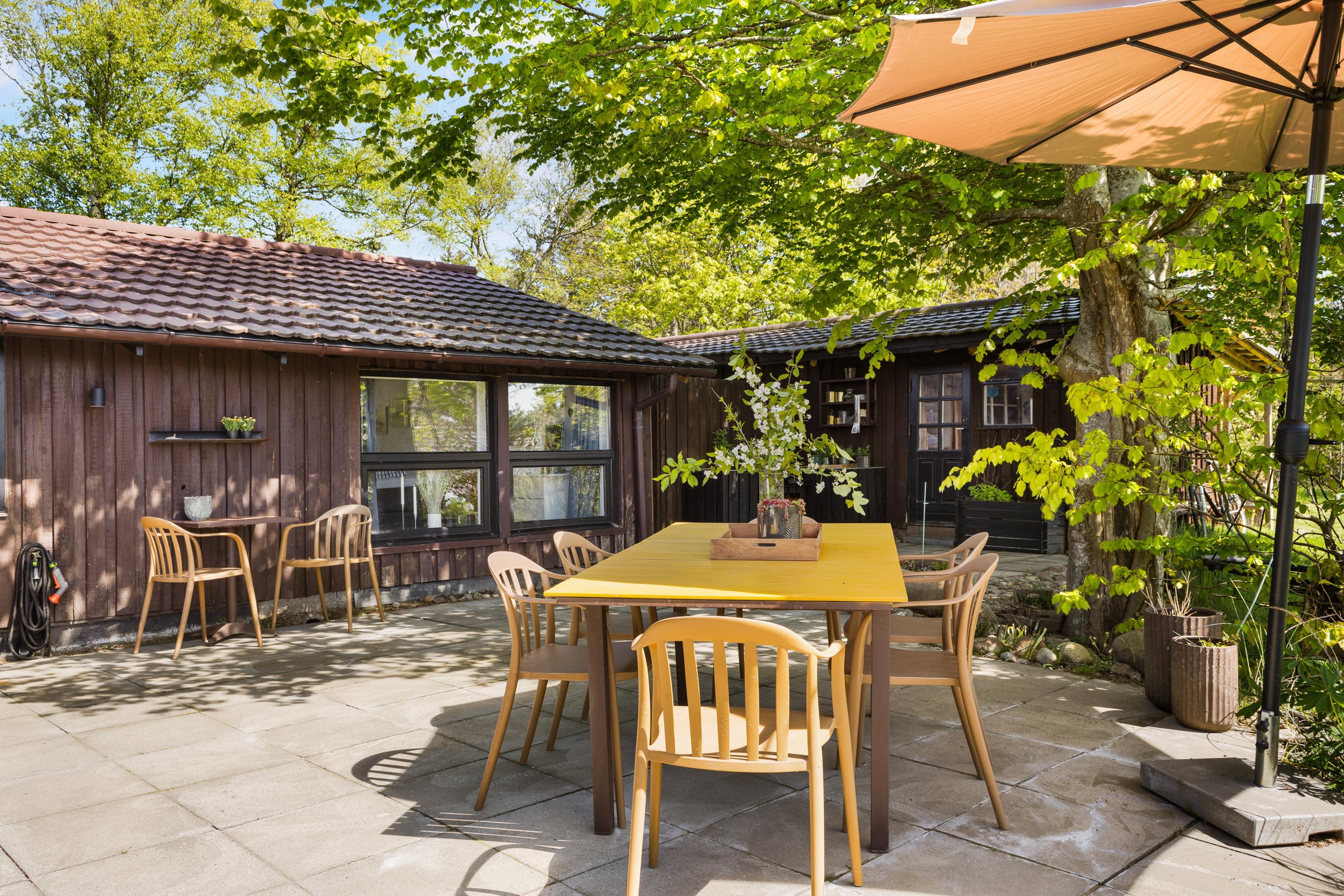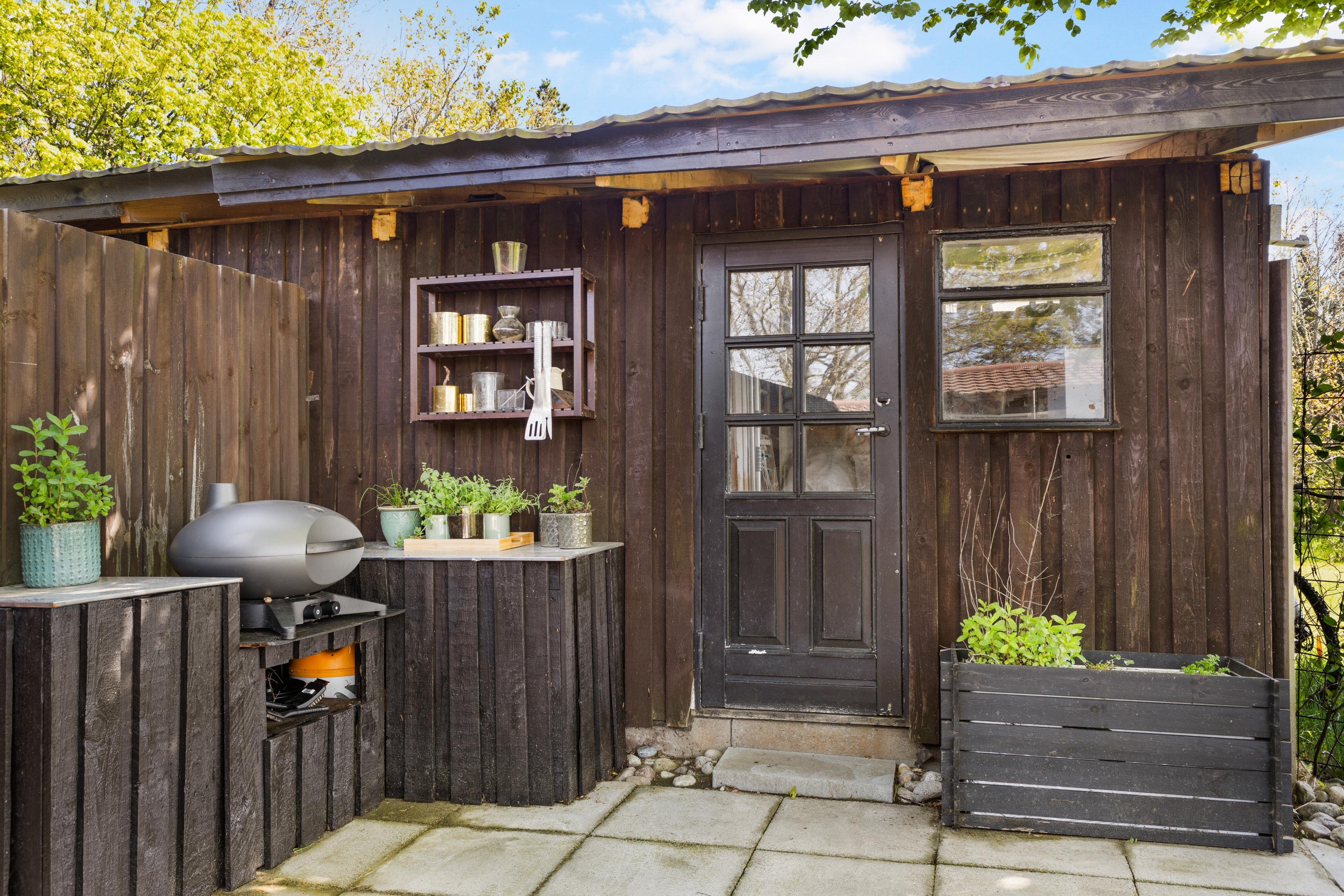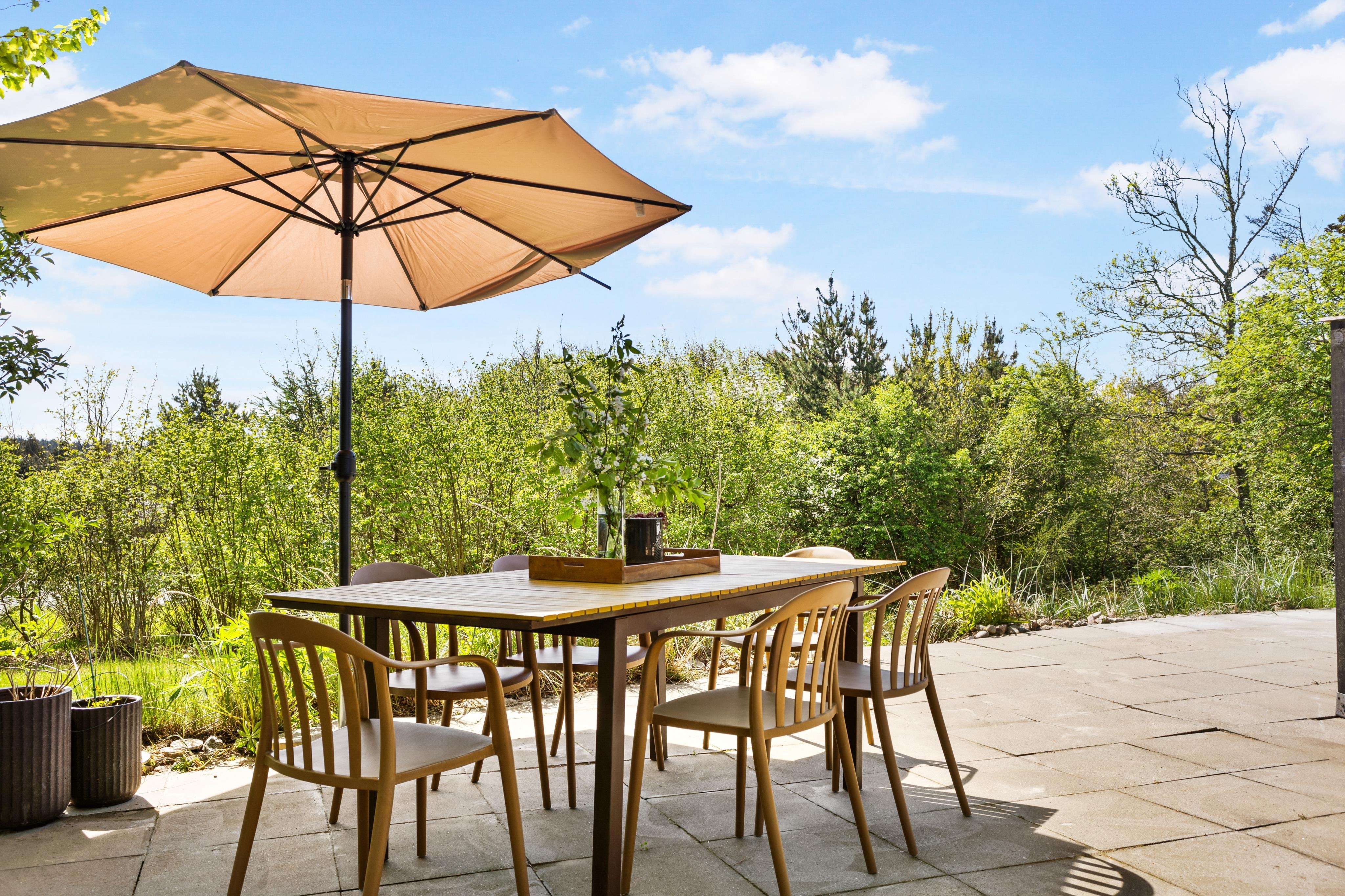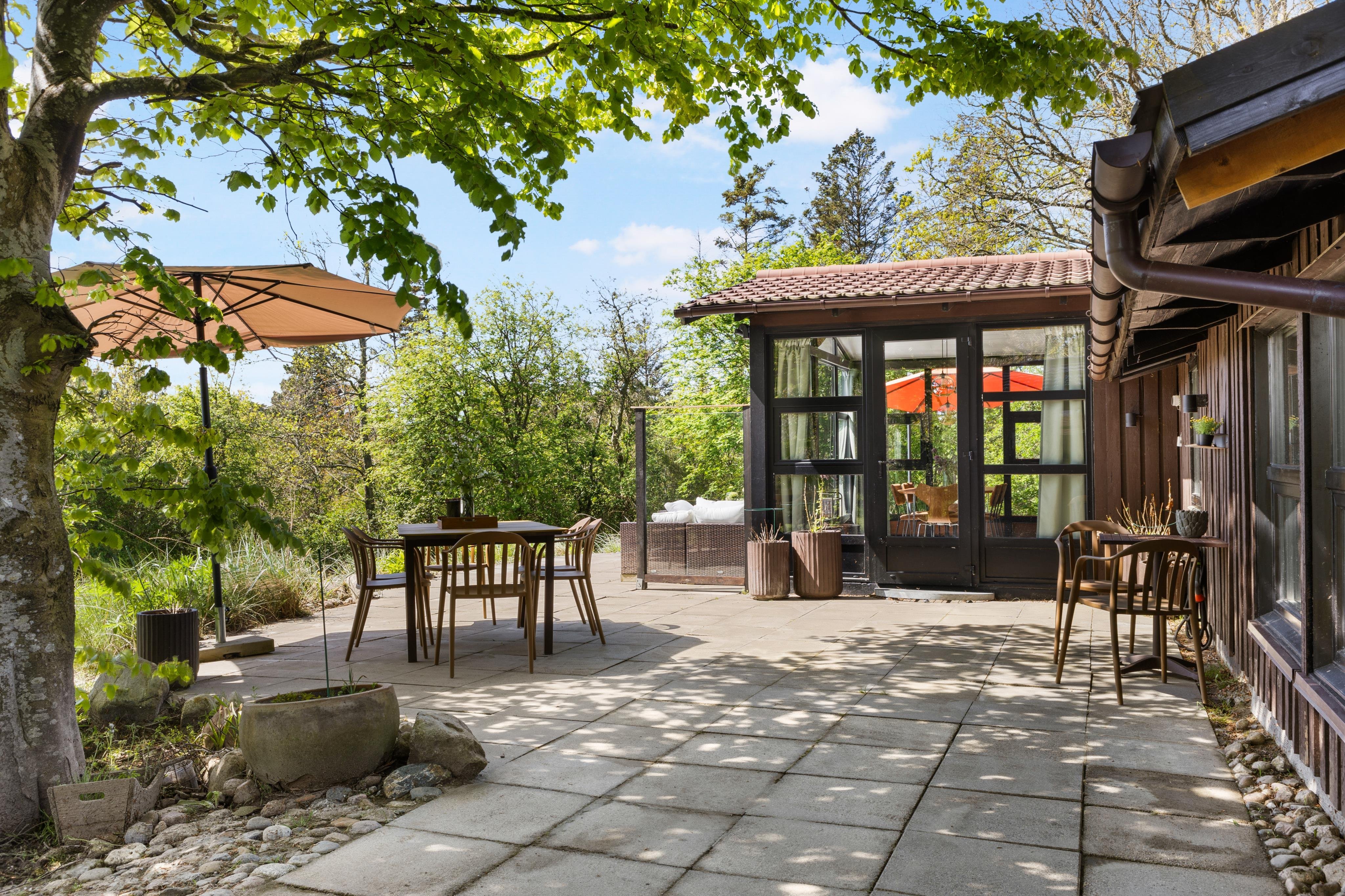 Udenfor huset er stort terrasseområde med udespa og grill - så her kan man benytte mange timer og nyde den danske sommer enten ved loungeområdet, i de bløde sofaer, i hyggestolene eller ved spisepladsen.