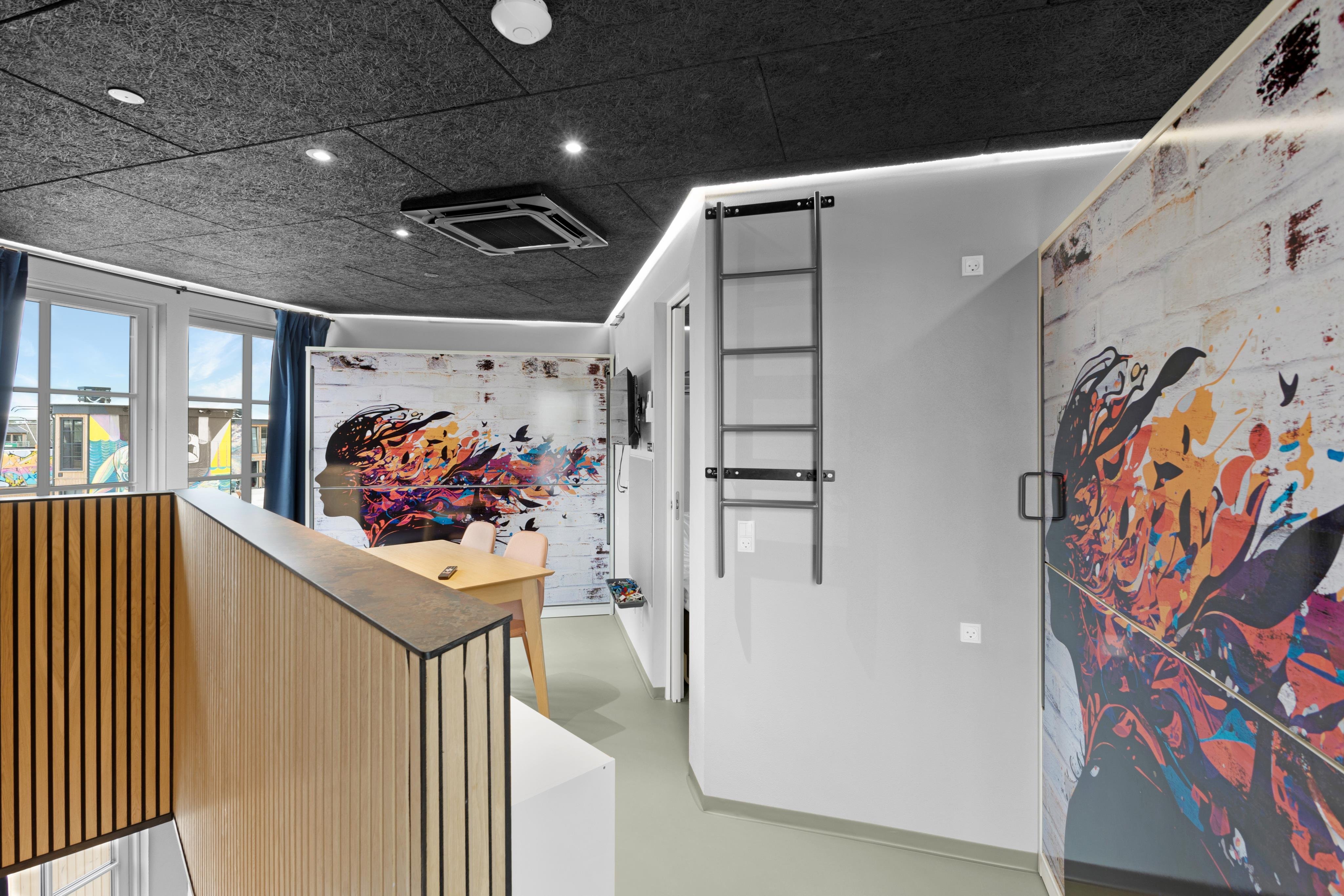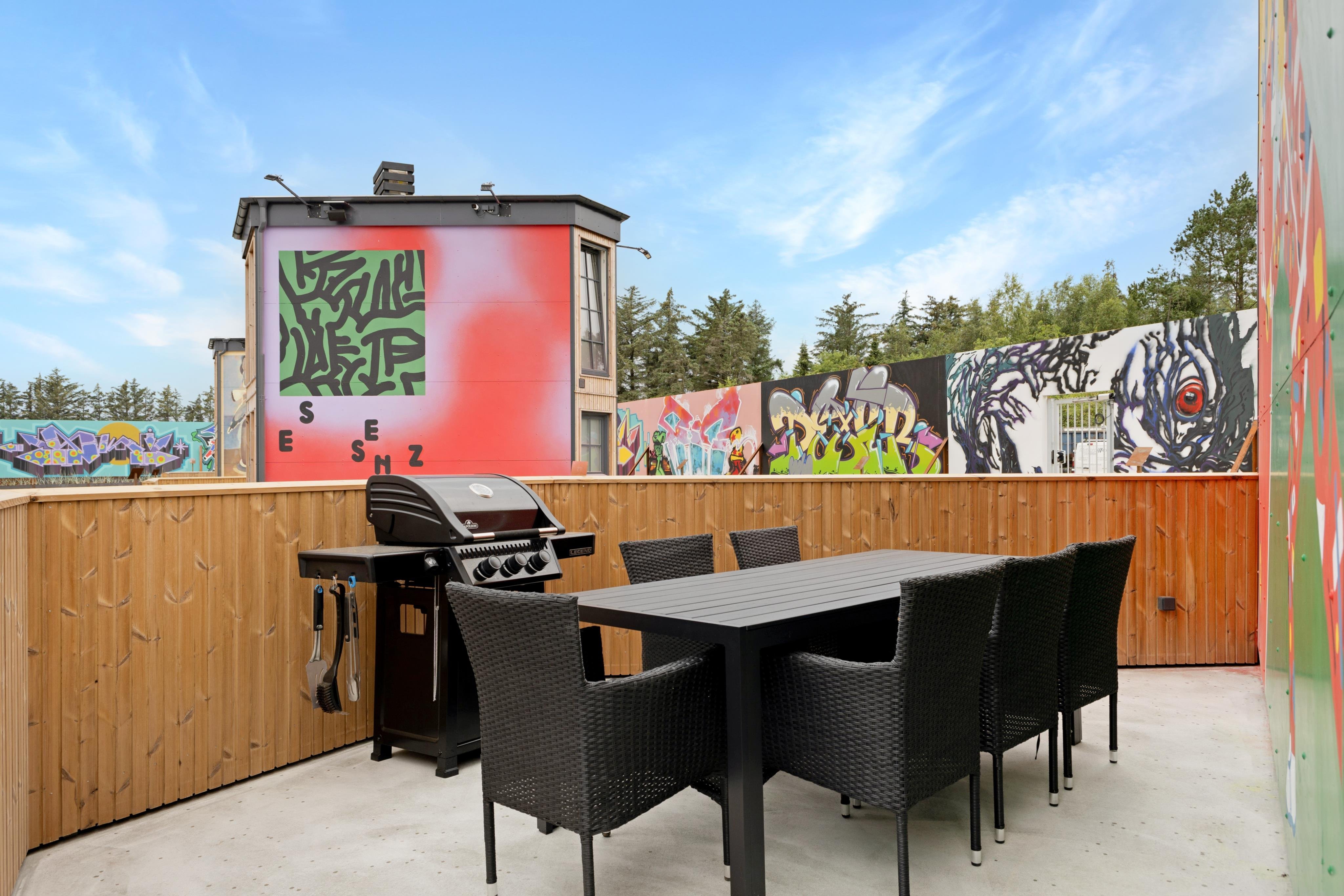 Ferielejlighederne har plads til op til 6 personer med fire køjesenge og en dobbeltseng på første sal - linned inkluderet. Hvis I er færre, kan køjesengene let foldes ind langs væggene, så I får mere plads og kan nyde de store vægmalerier, sengene gemmer på. Hver kvadratmeter er optimalt udnyttet, og I har alt, hvad I behøver til en komfortabel overnatning nær Blokhus. I stueetagen finder I et køkken/alrum, badeværelse og en dejlig terrasse, udstyret med opvaskemaskine, vaskemaskine, tørretumbler og grill. Når der er koncerter eller andre events, bliver det en særlig oplevelse at være en del af stemningen og bevæge sig rundt i Fun Art! Der er også ladestandere til elbilen, og alle lejlighederne er røgfri.