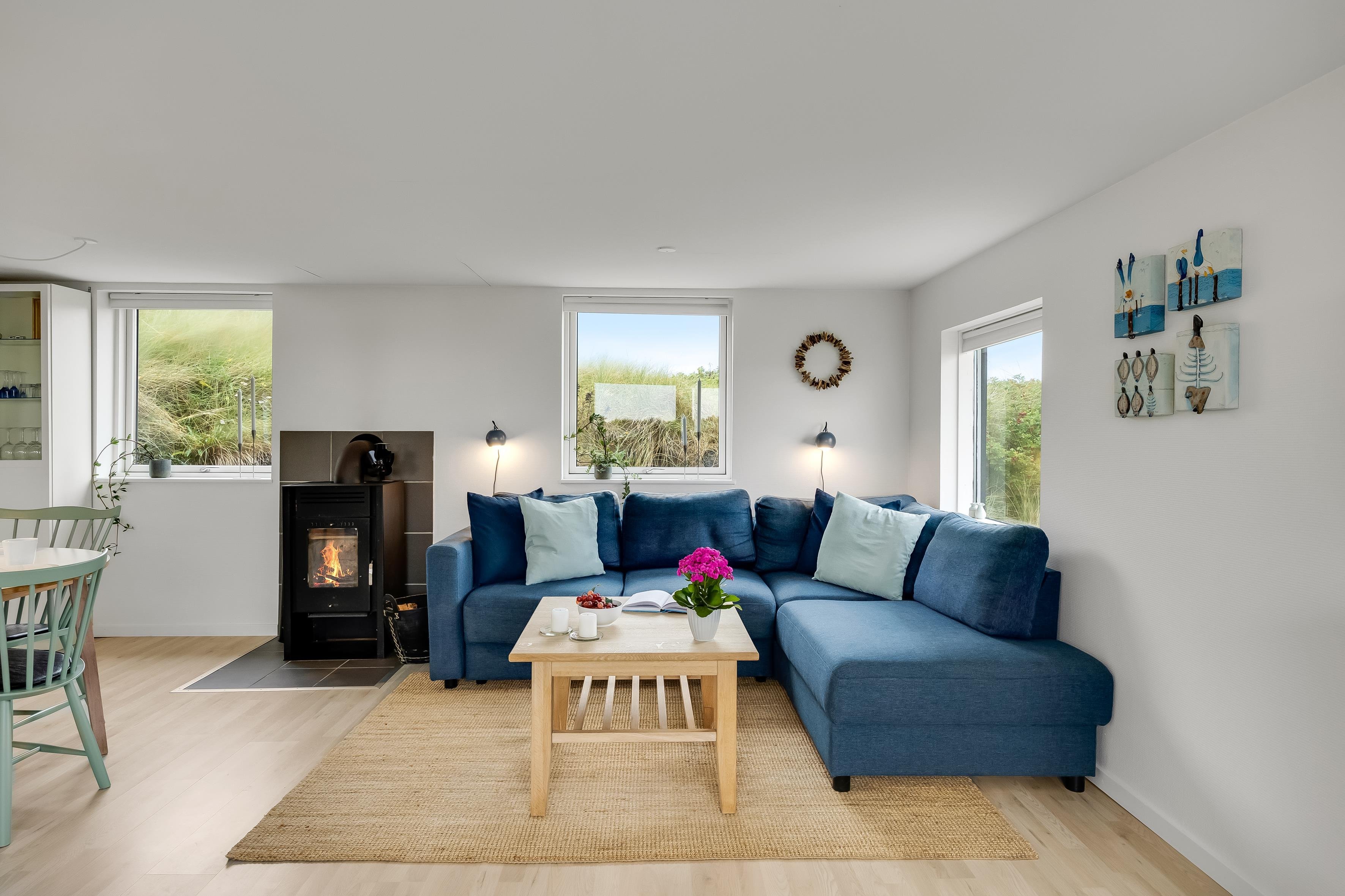 De store vinduer lader lyset strømme ind og giver et fantastisk kig til naturen omkring huset – perfekt til afslapning i fredelige omgivelser tæt på vandet. Dette hus emmer af klassisk, dansk sommerhusudlejning, når det er bedst.