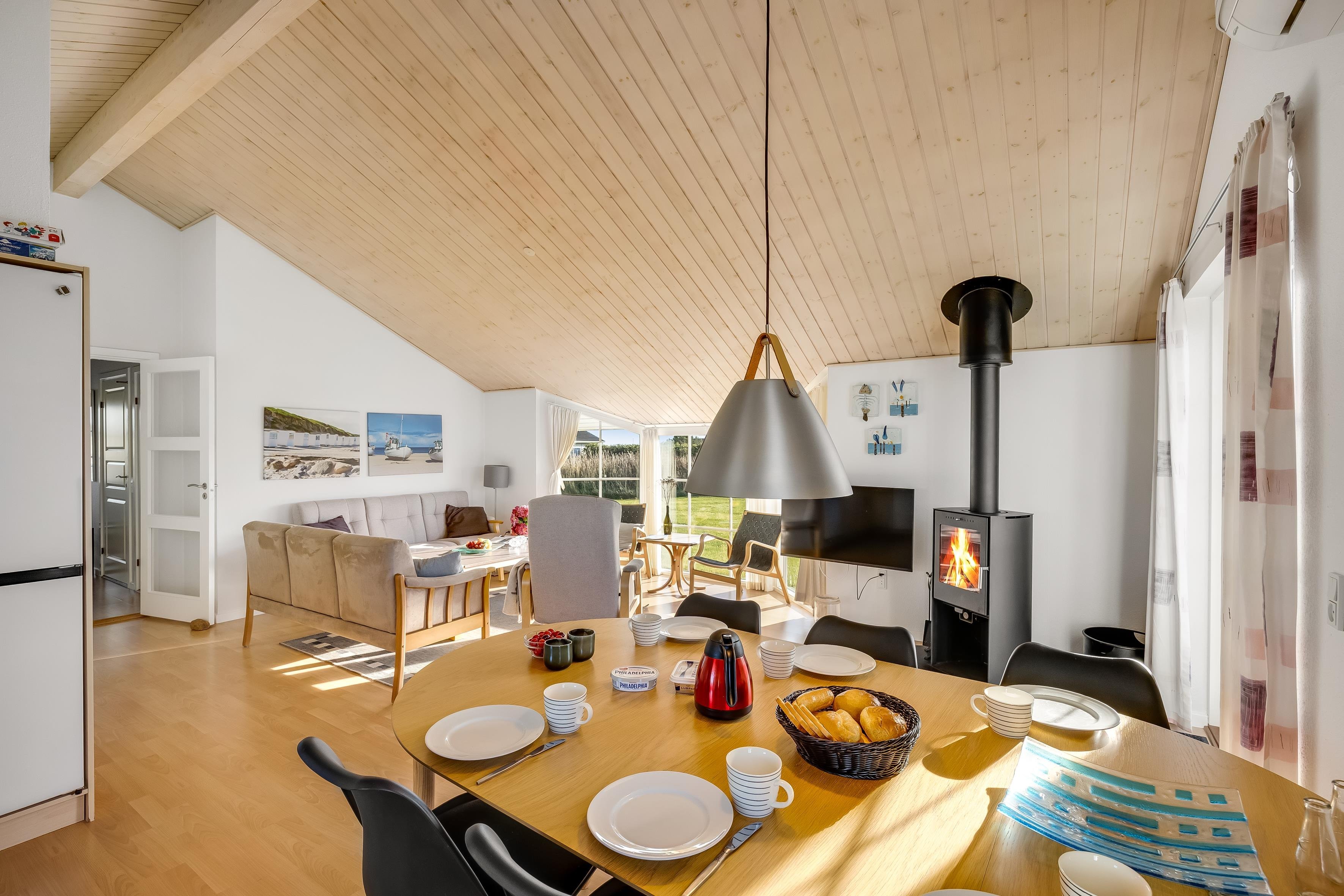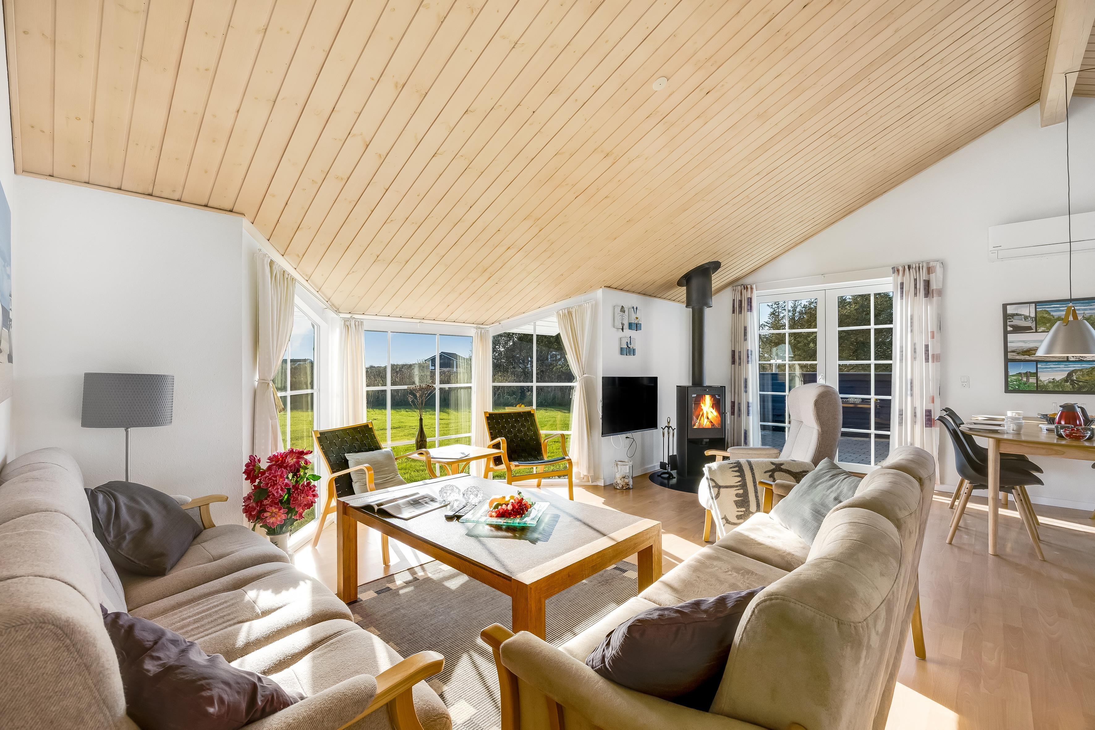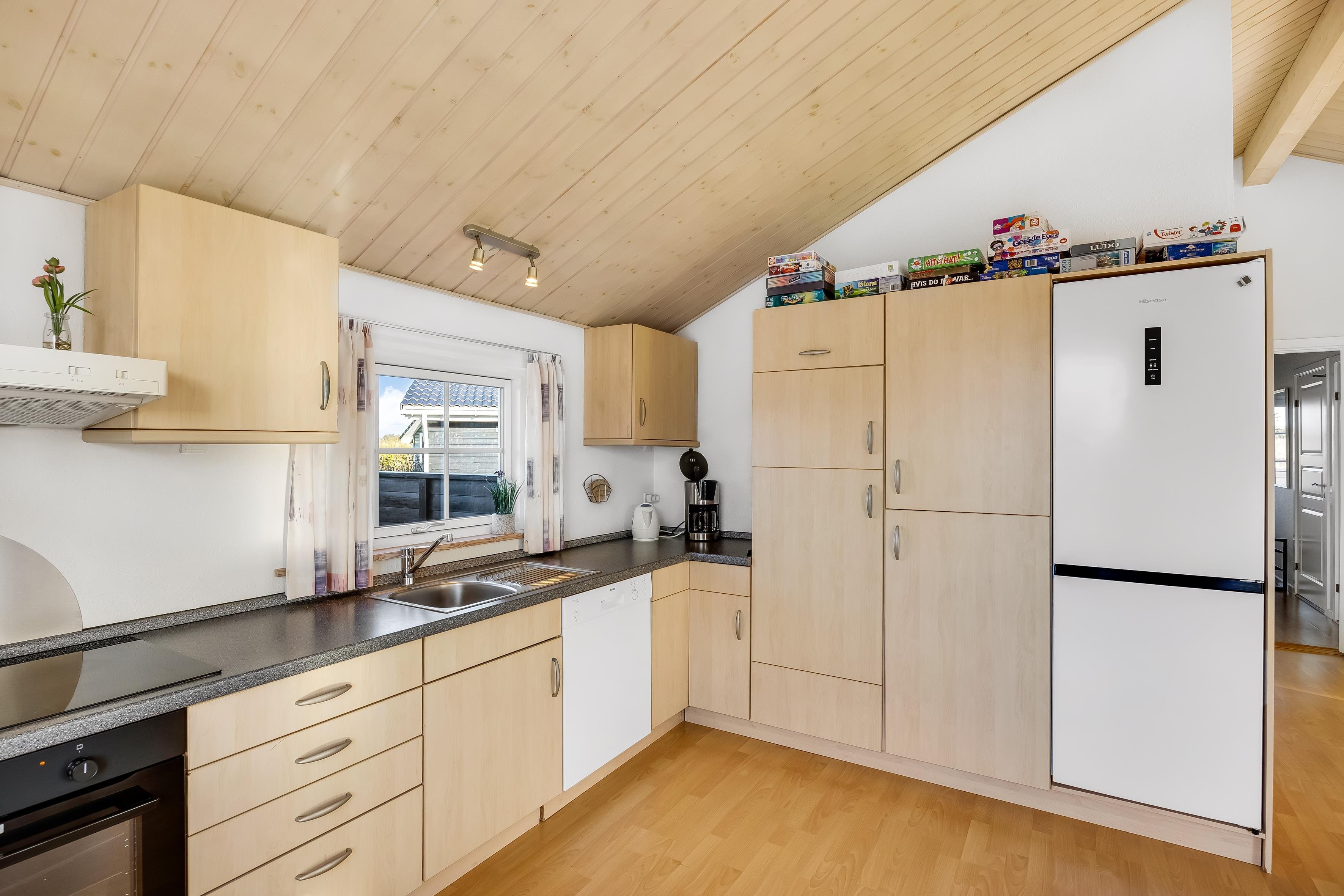 Sommerhuset er moderne og godt udstyret med energivenlig varmepumpe, vaskemaskine, brændeovn og en fryser med 60 liters kapacitet. Køkkenet er udstyret med alt, hvad du har brug for: induktionskogeplader, opvaskemaskine, mikrobølgeovn, varmluftovn og køleskab. Der er ét stort badeværelse med gulvvarme og bruseniche samt et ekstra gæstetoilet – også med gulvvarme.