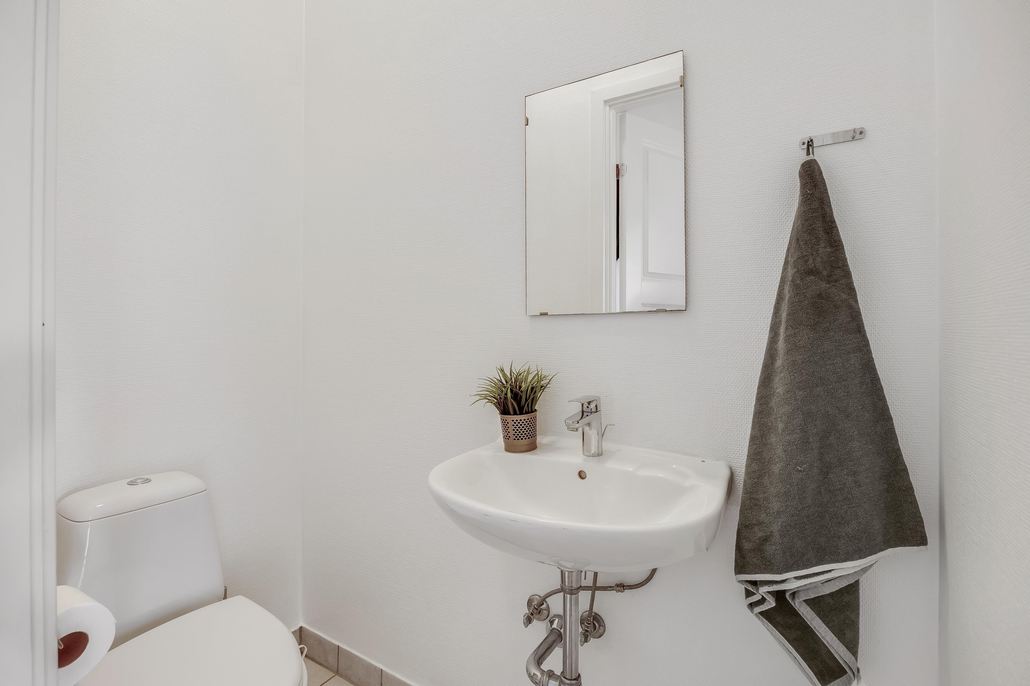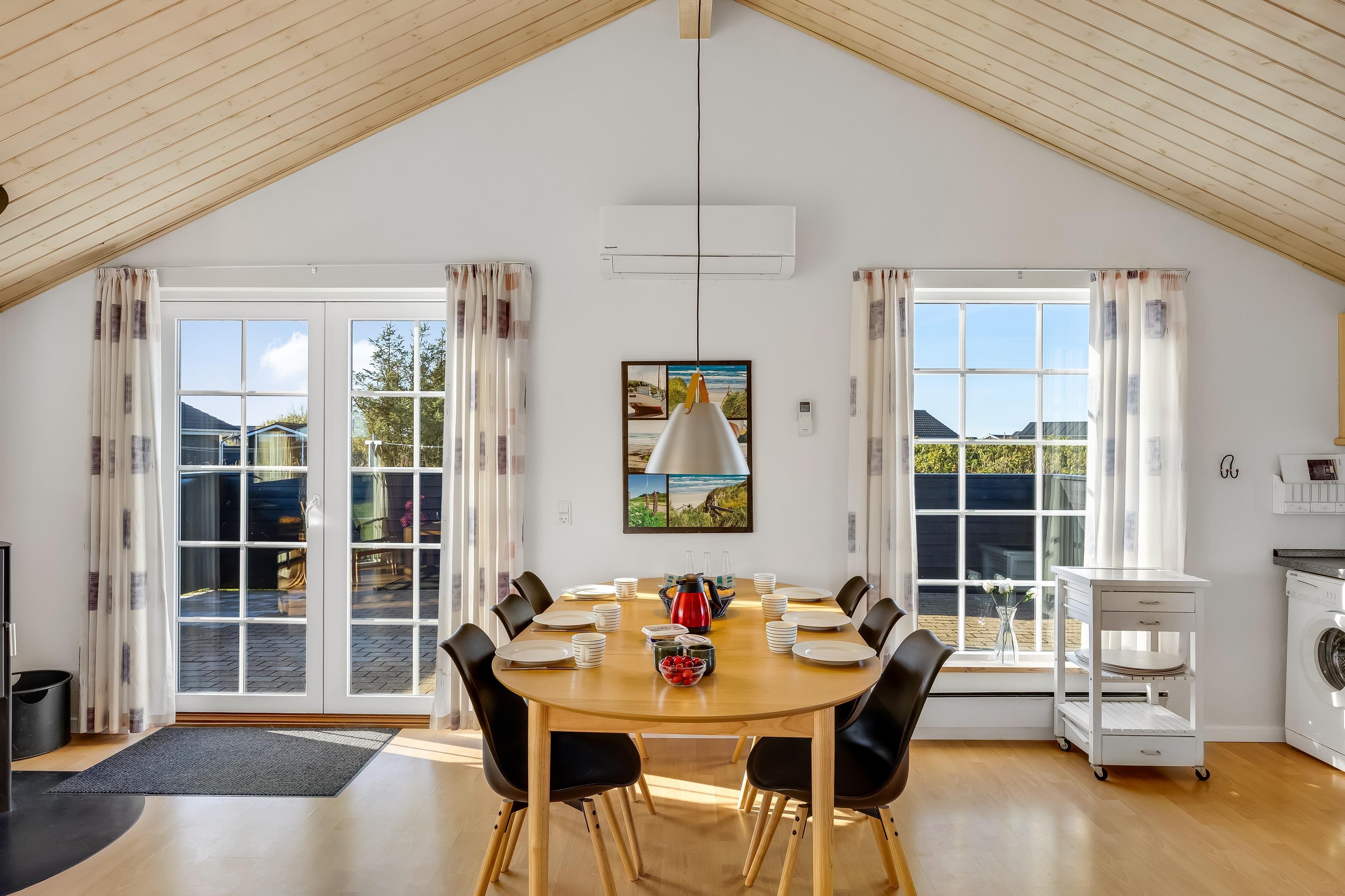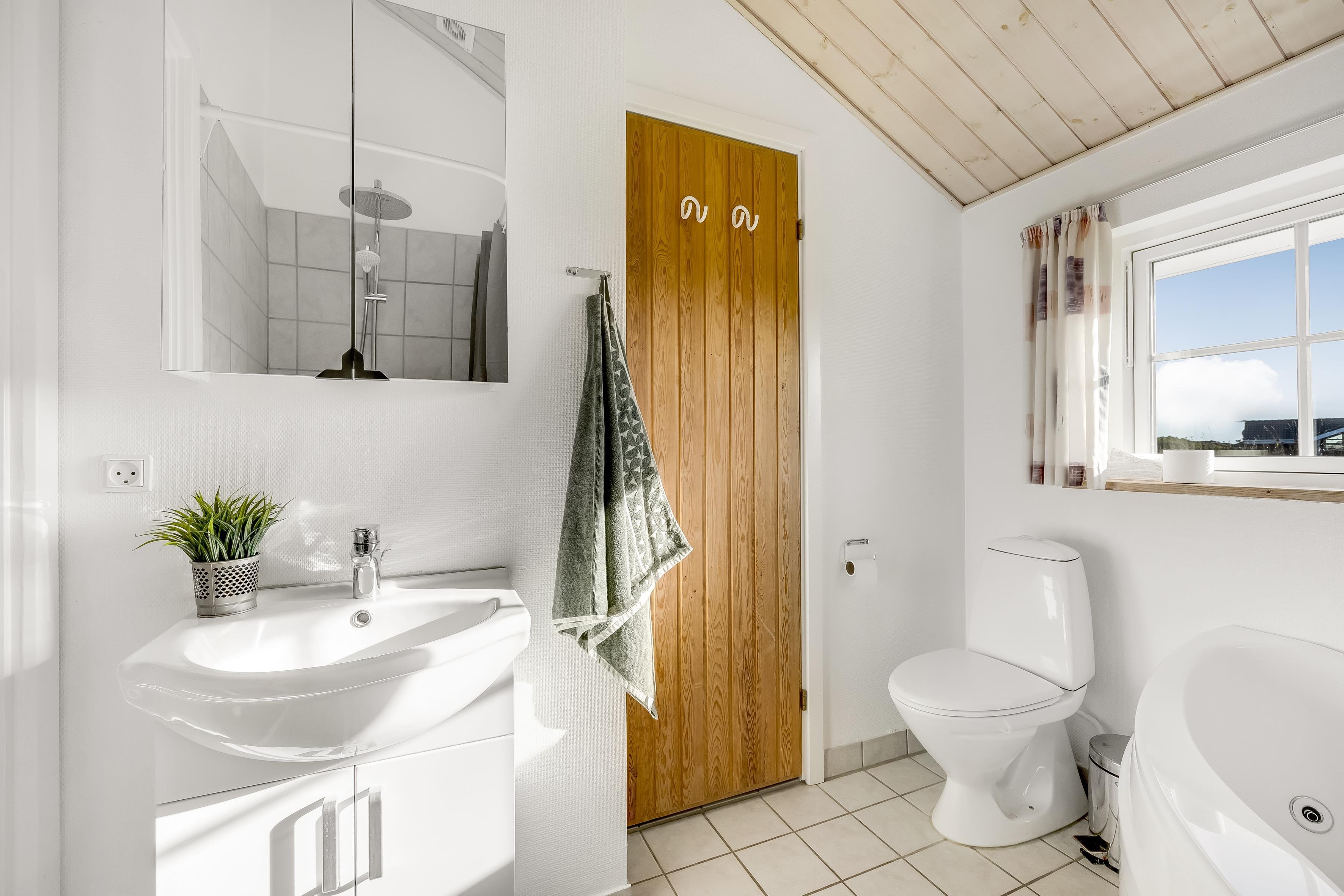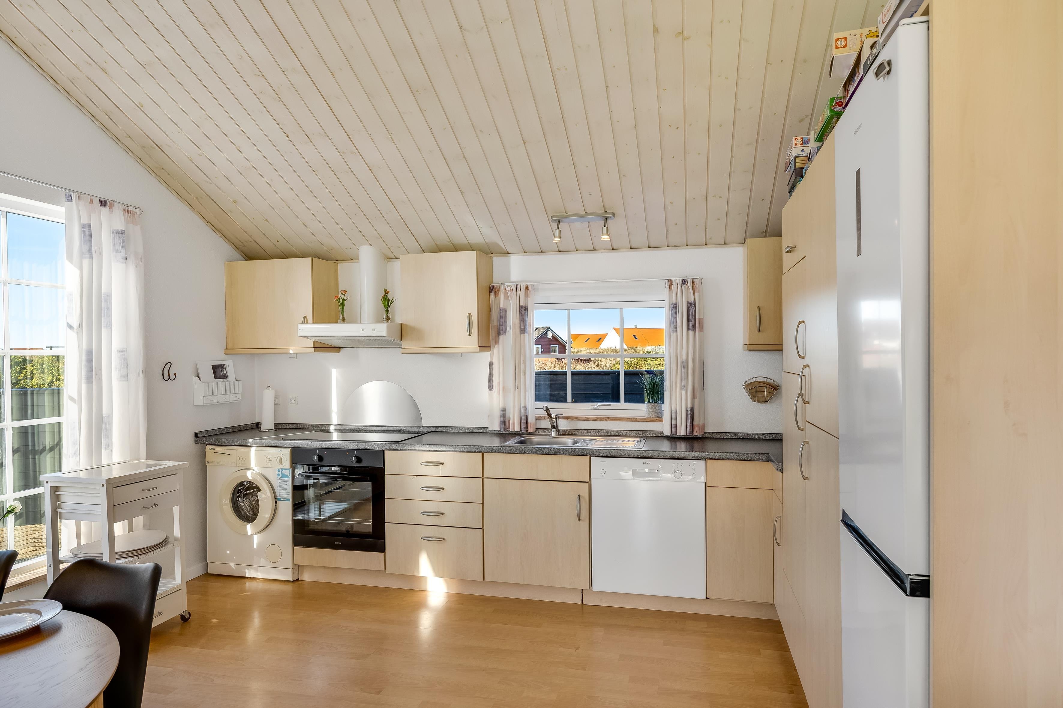 Sommerhuset er moderne og godt udstyret med energivenlig varmepumpe, vaskemaskine, brændeovn og en fryser med 60 liters kapacitet. Køkkenet er udstyret med alt, hvad du har brug for: induktionskogeplader, opvaskemaskine, mikrobølgeovn, varmluftovn og køleskab. Der er ét stort badeværelse med gulvvarme og bruseniche samt et ekstra gæstetoilet – også med gulvvarme.