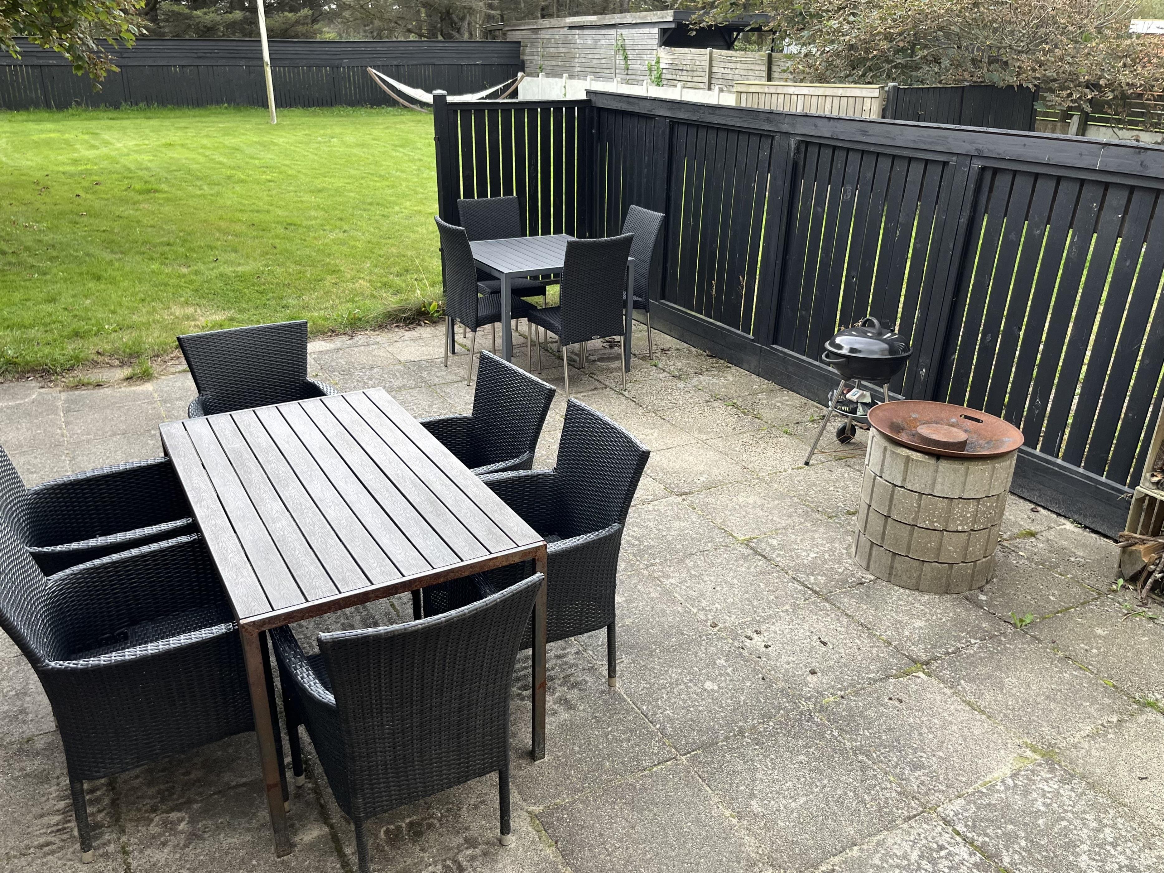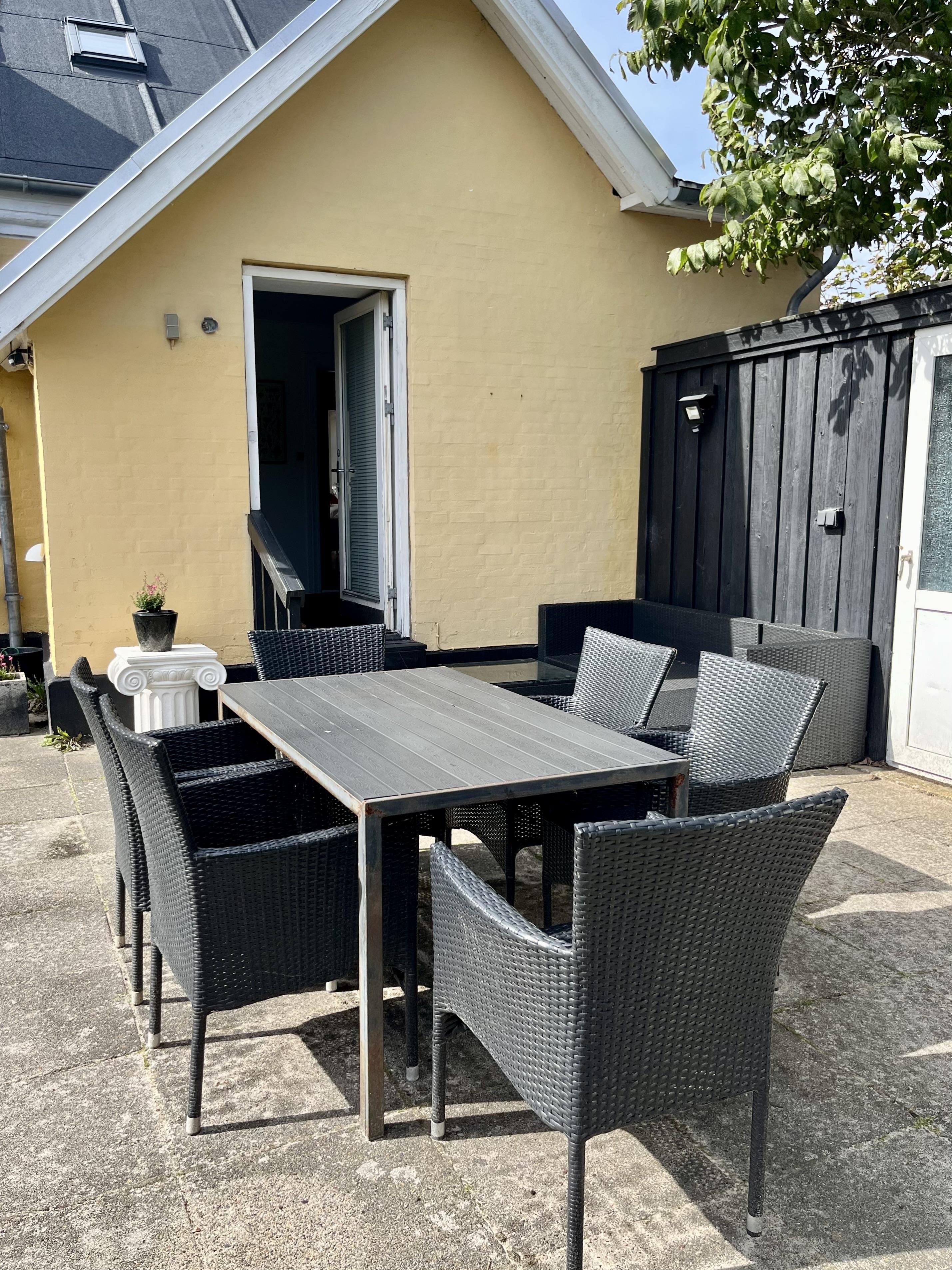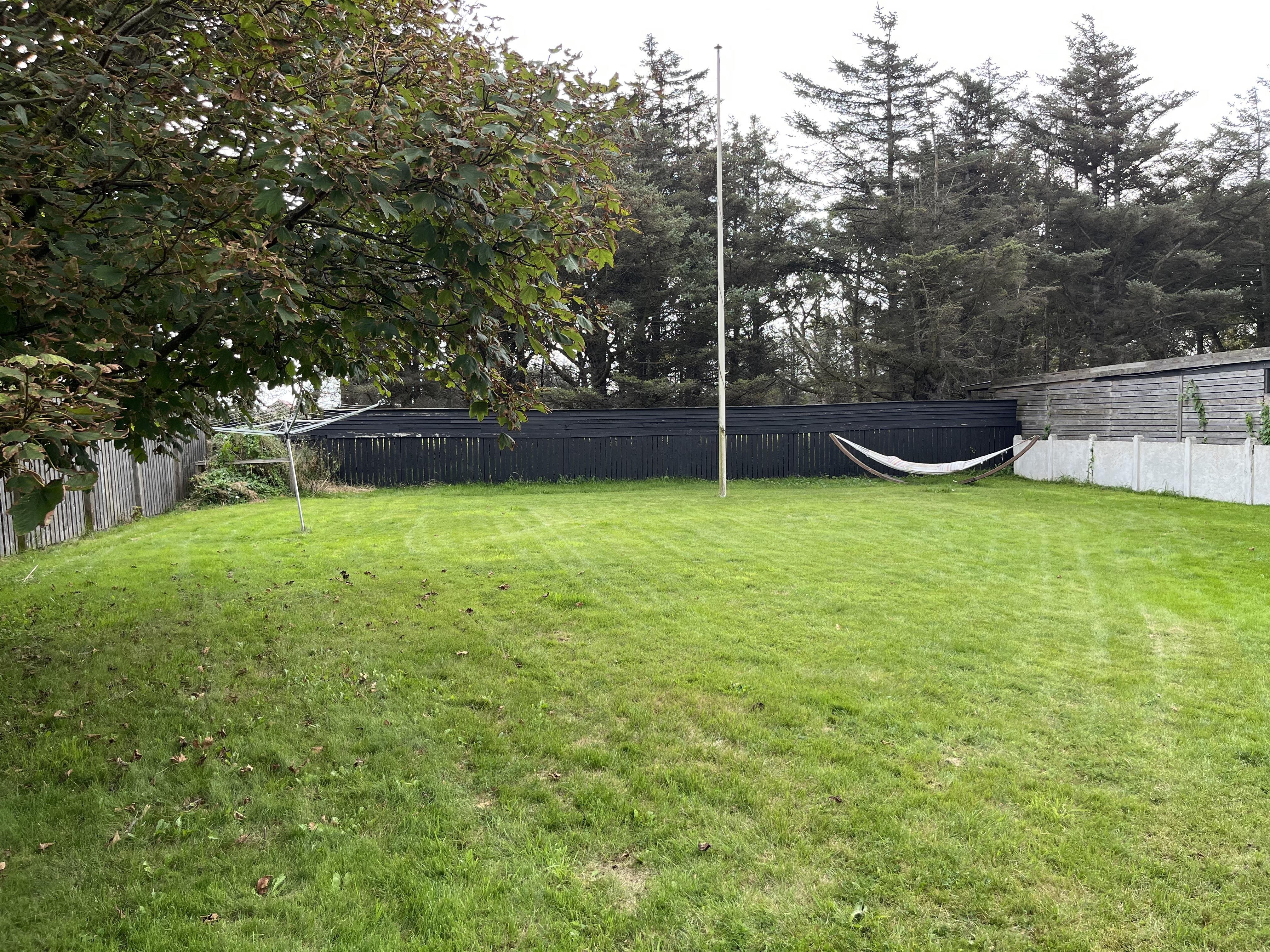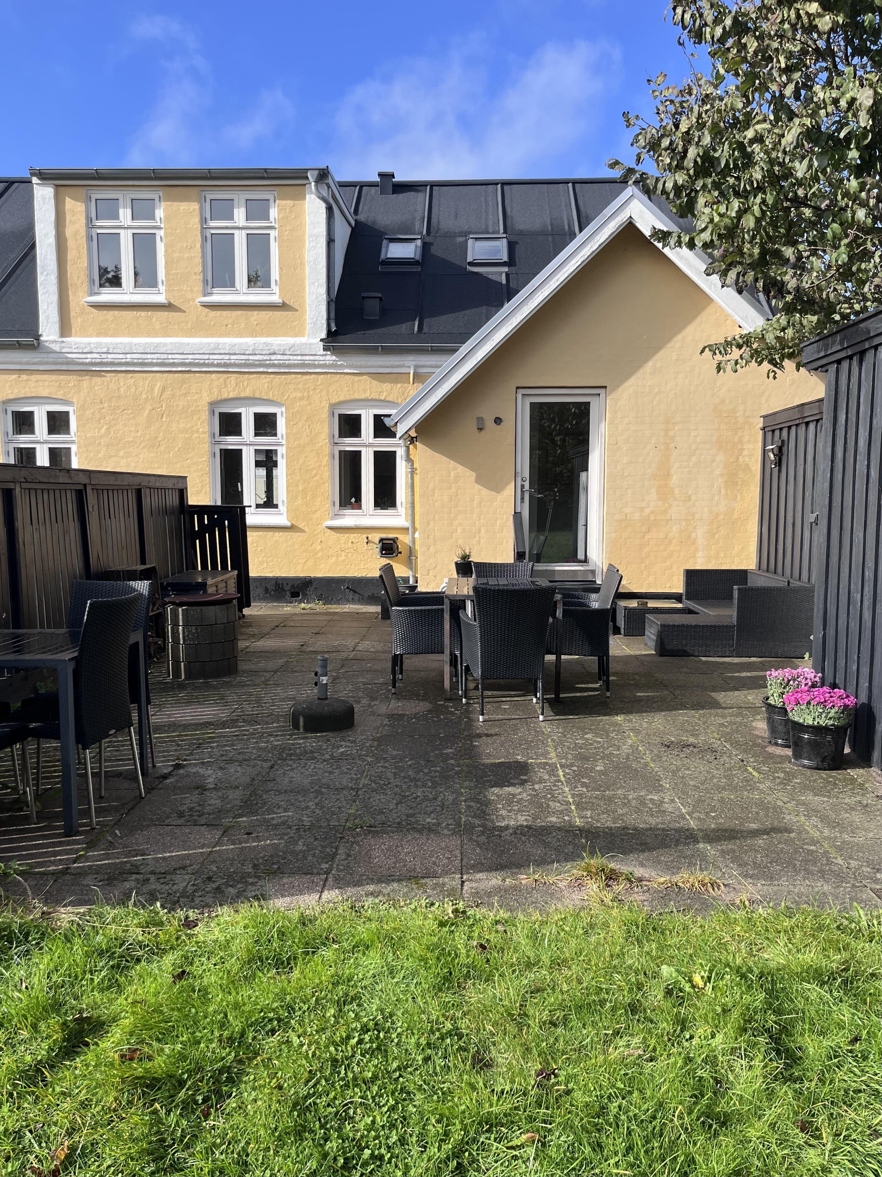 Haven er stor og støder op til et grønt område ved Løkken Skole, så der er ingen bebyggelse i baghaven. Terrassen og haven deles med lejligheden i stueplan og skaber et skønt uderum med masser af plads og en følelse af ro, selvom du bor midt i byen og tæt på Vesterhavet.