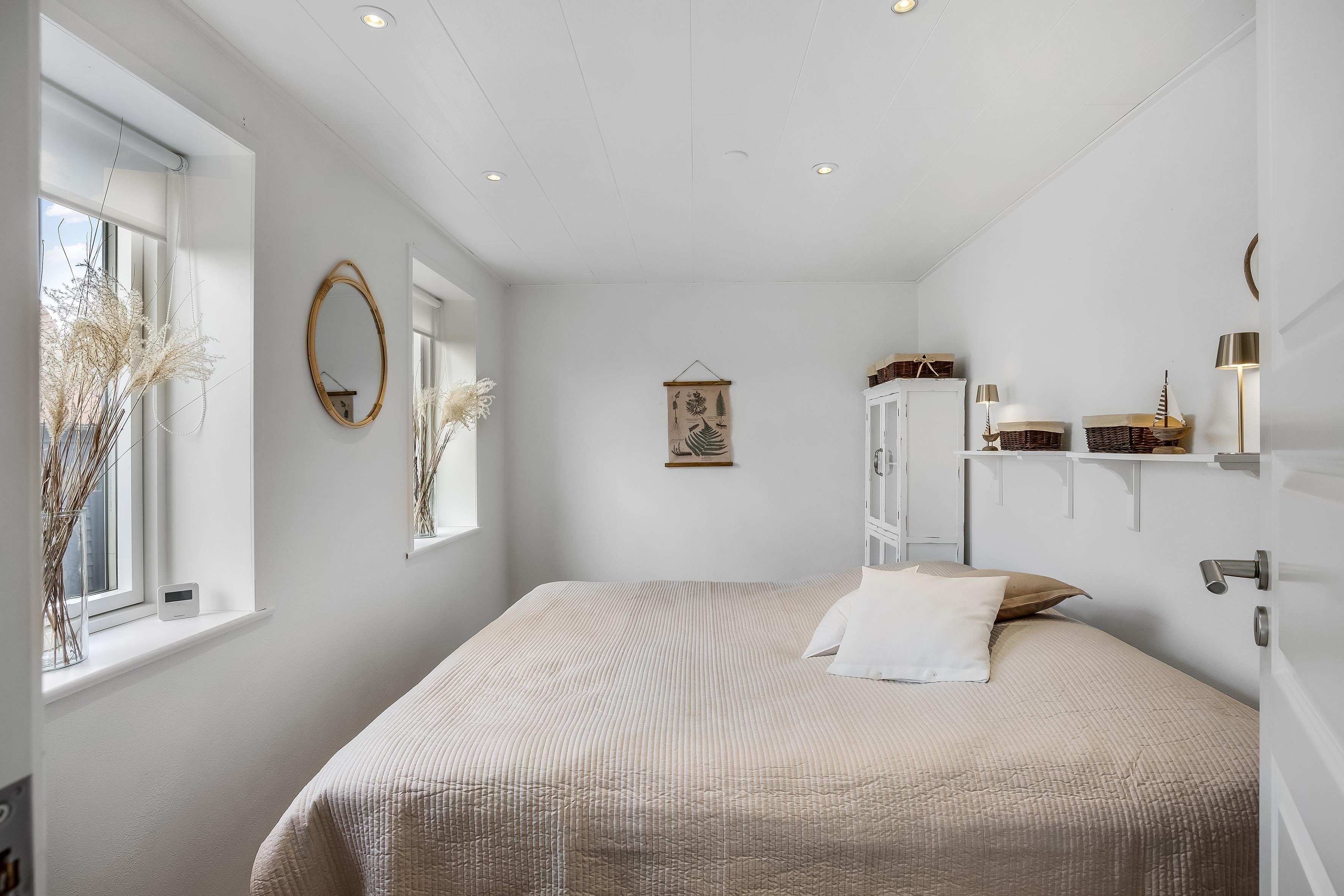 Huset har et stort og lyst køkken/alrum og stue i åbent plan med den charmerende, snoede spindeltrappe op til 1. sal. Der er et dejligt badeværelse, og soveværelset ved siden af stuen har dobbeltseng. I stuen er der en sovesofa.