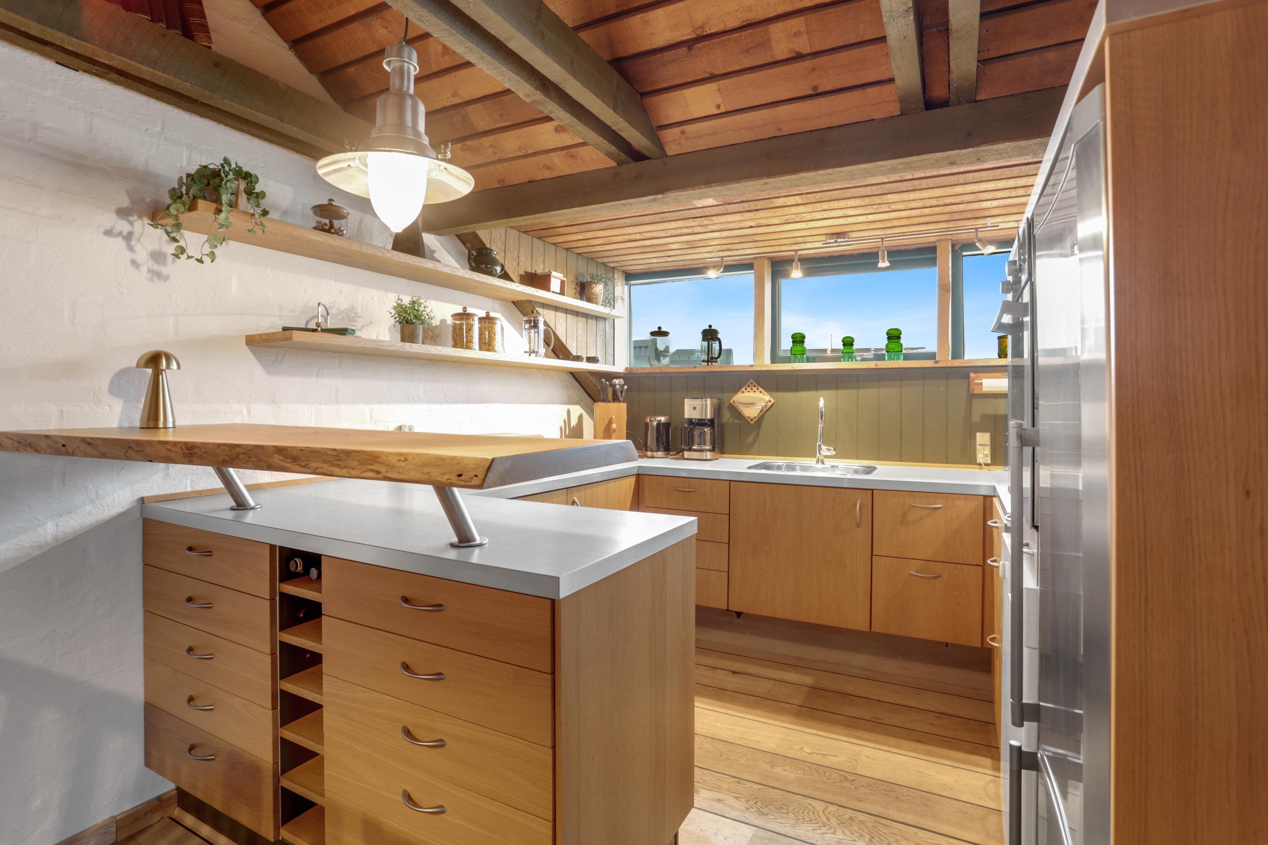 På første sal er husets køkken/alrum i åben forbindelse til stuen, med terrasse en suite, så naturen kommer helt ind i rummet. Herfra kan du se ned til Løkken centrum, mens Vesterhavet bruser i baggrunden. Også denne etage er helt enormt hyggeligt indrettet med en stor alkove, der kan fungere som både flyder sofa og 2 ekstra sovepladser. Fra både køkken og stue kan du nyde brændeovnen, der er centralt placeret.
