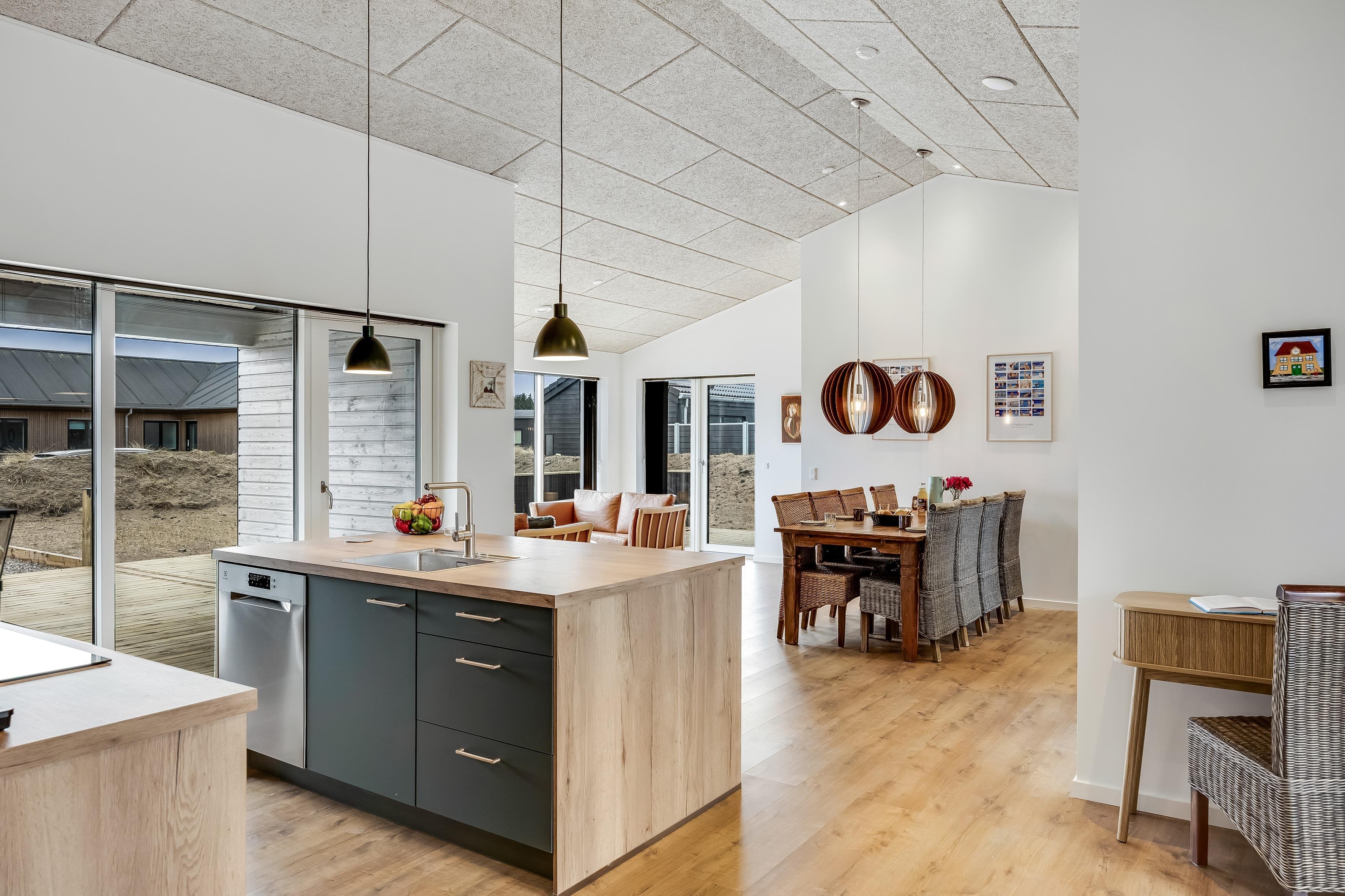 Huset har plads til 6 personer fordelt på 3 soverum med dobbeltsenge. Her får du en bolig med et flot, åbent køkken-alrum i forlængelse af stuen, hvor indretningen er lys og gennemtænkt med udgang til det store, skønne terrasseområde. Badeværelserne er rummelige og stilfulde, og huset er generelt bygget med sans for detaljer og moderne bekvemmeligheder.