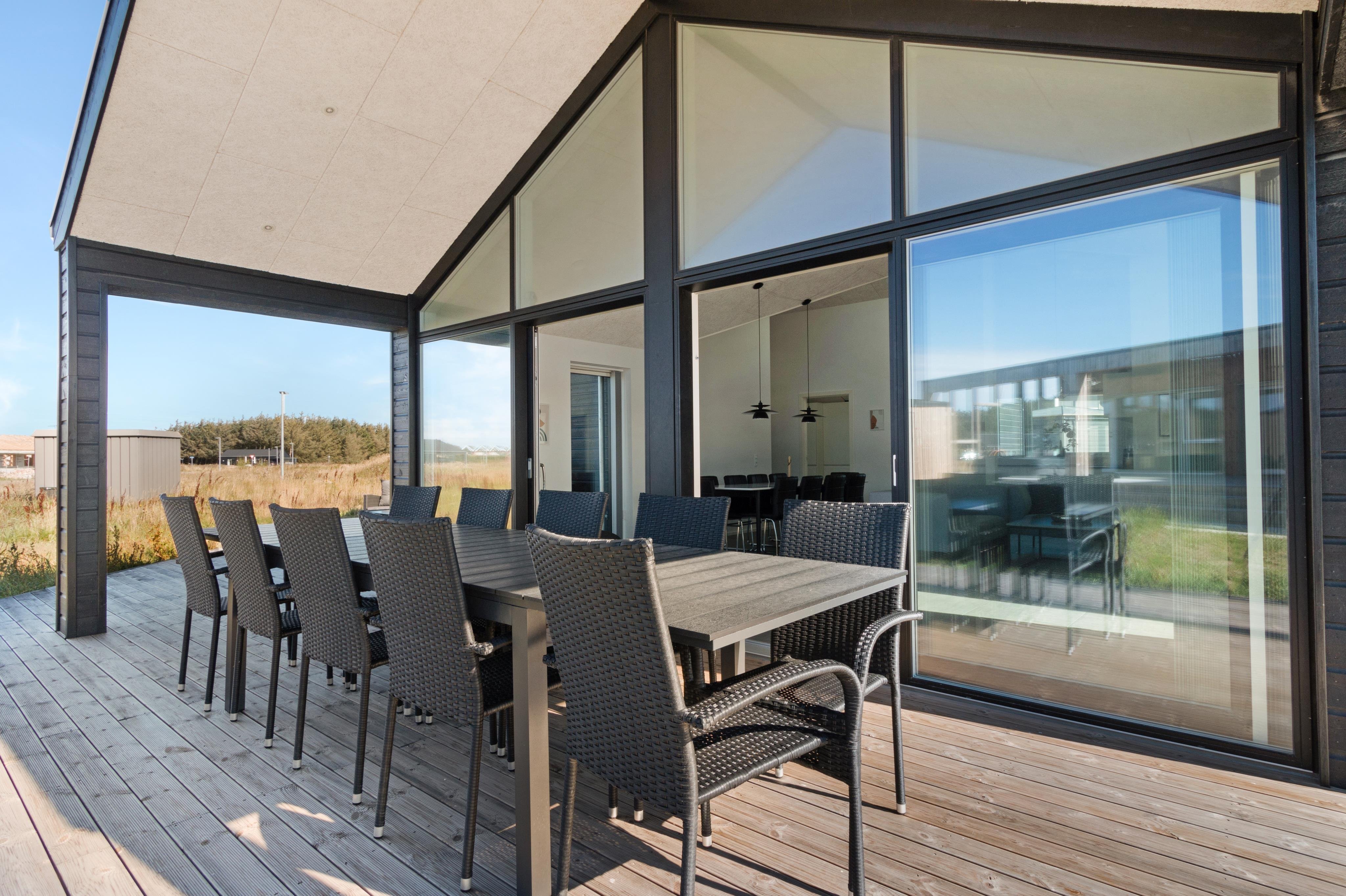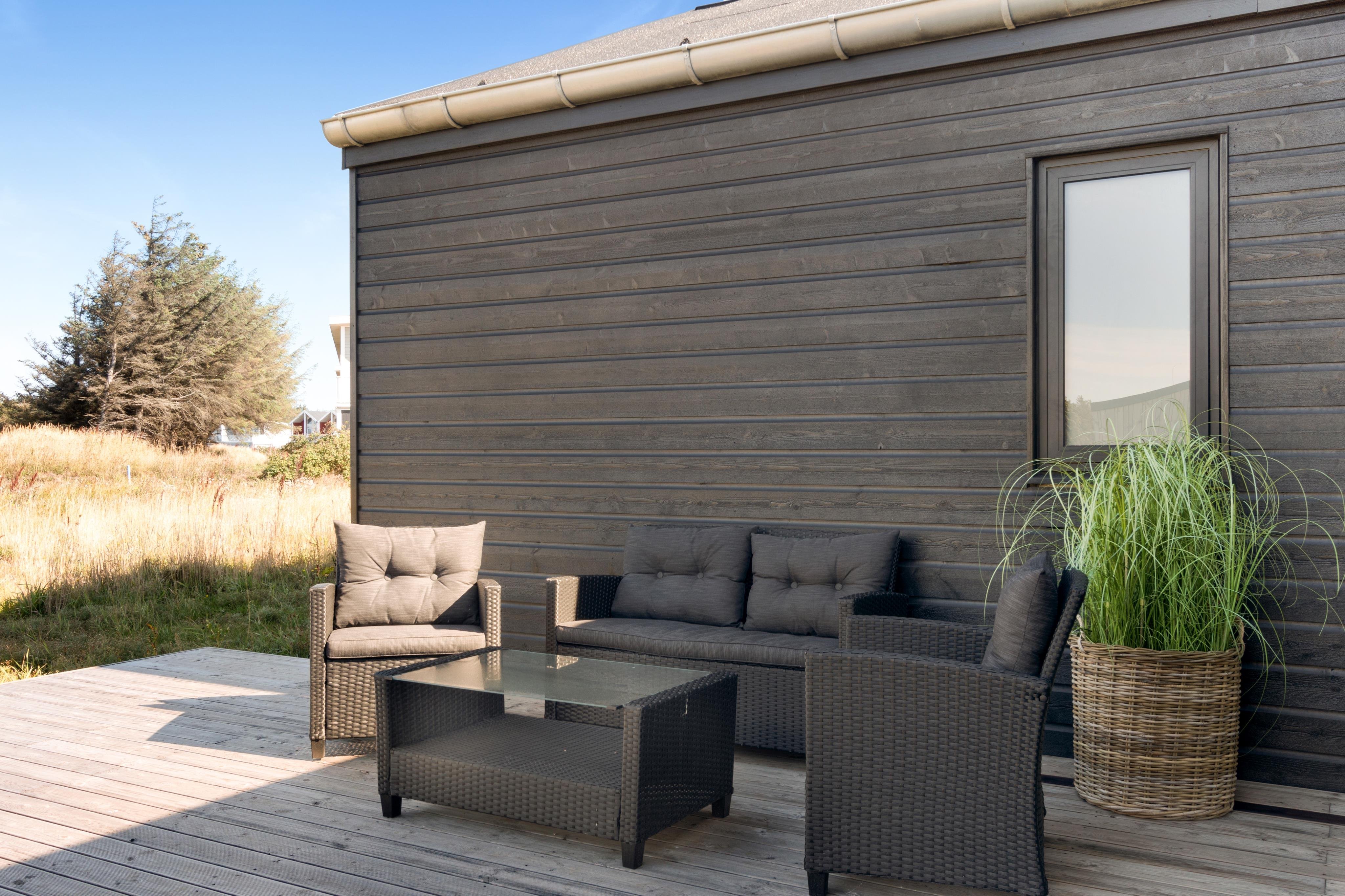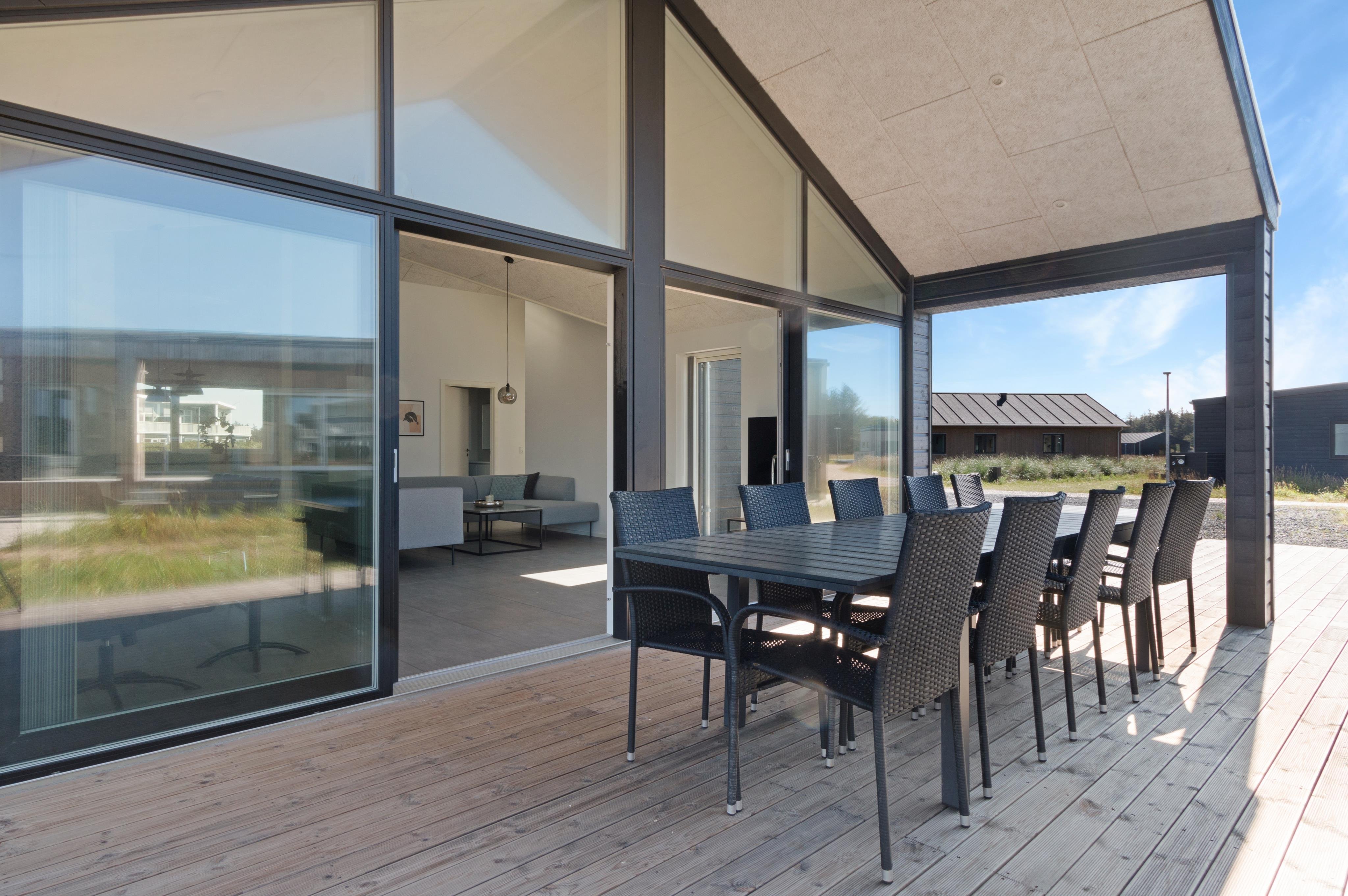 Som nævnt kan du tilgå den store terrasse direkte fra sommerhusets stue, og der er flere vinkler at finde sol og læ, såvel overdækket som i åben himmel. Her indbyder til skøn afslapning i sommersolen, eller i en god vindjakke i selskab med en bog, når vejret viser sig fra en lidt køligere side. Omkring dig er udsigt til flotte sommerhuse og masser af feriestemning. Der er mulighed for at parkere i carport og på den store indkørsel foran huset.