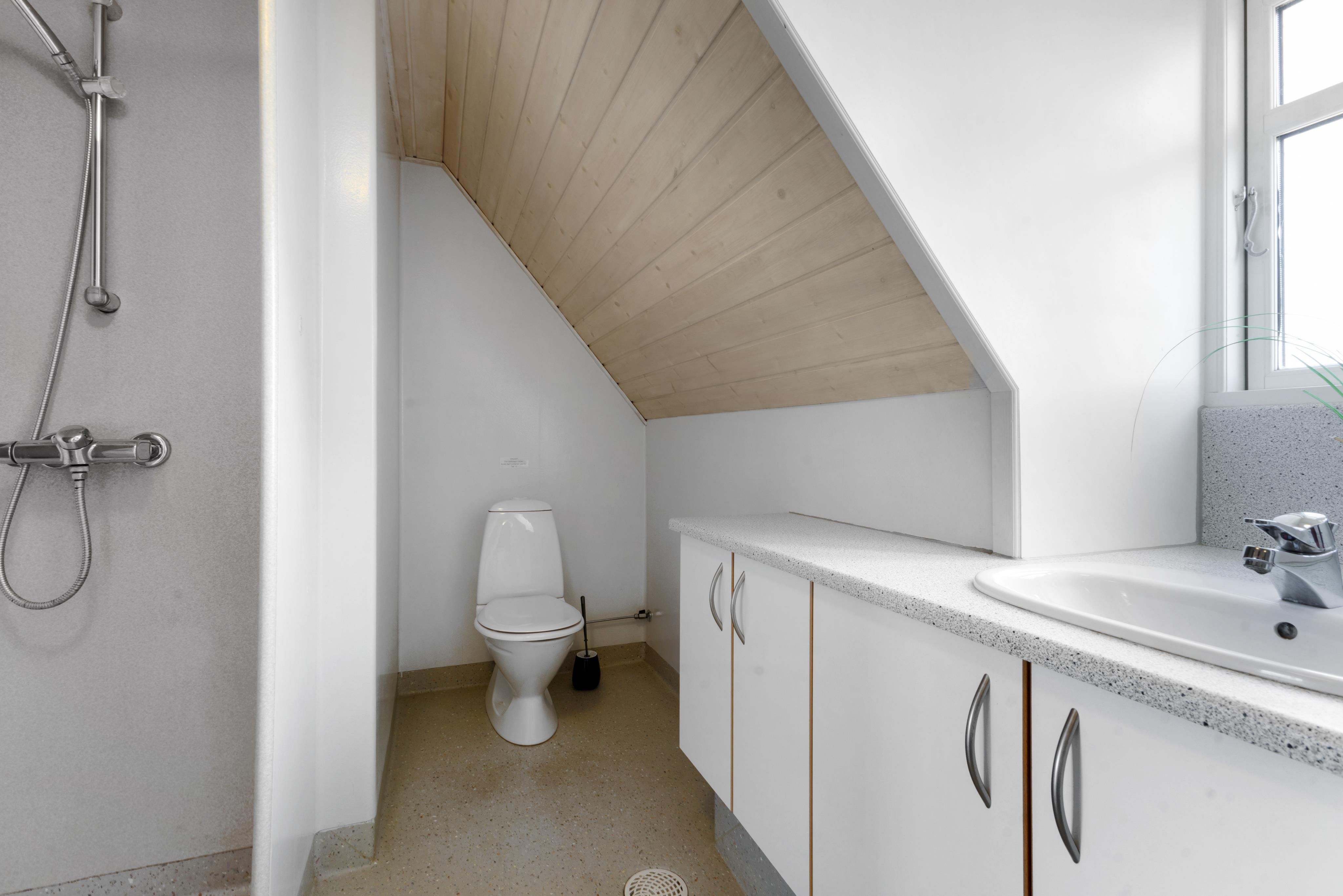 Der er et skønt badeværelse og et soveværelse med dobbeltseng.
