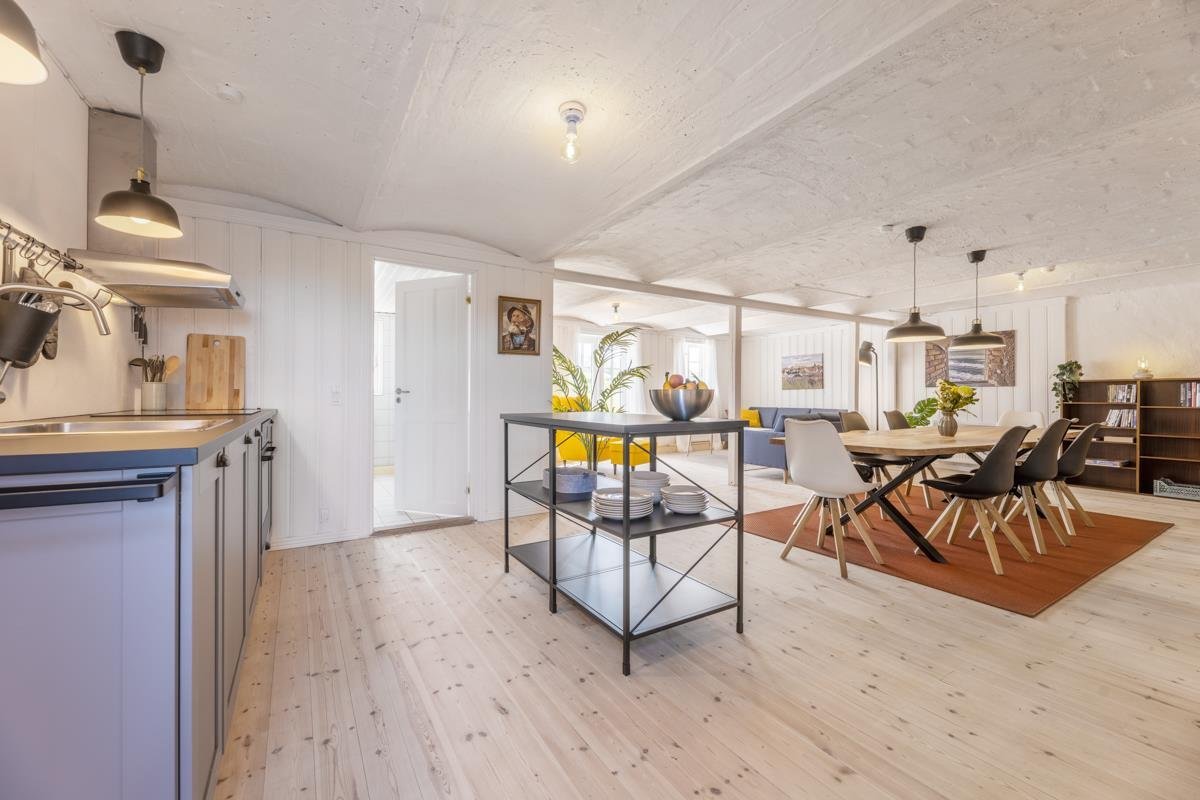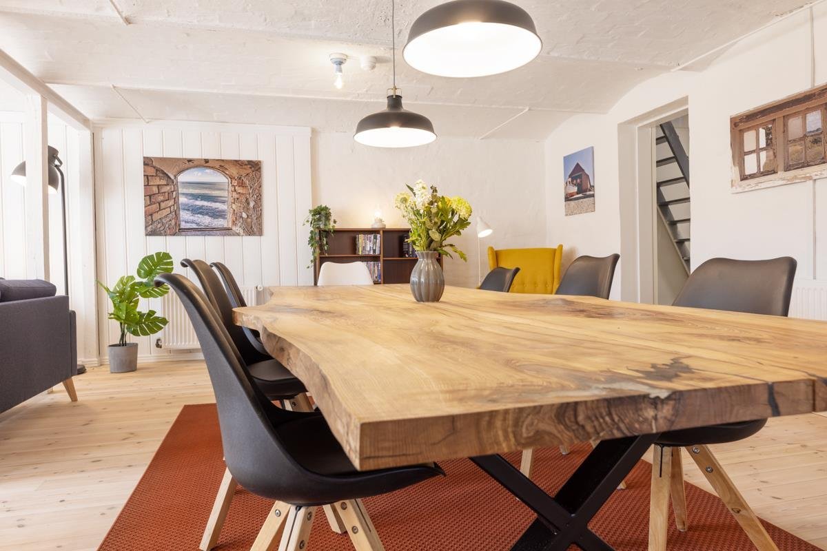 Træd ind i Kostalden og oplev en indbydende atmosfære! I det store køkken-alrum kan I spise hele 14 personer sammen omkring det lange spisebord, og stuen er designet til at skabe hyggelige stunder.