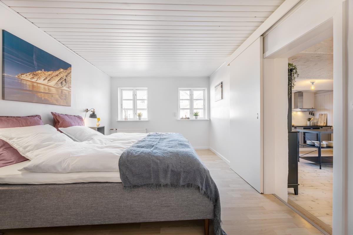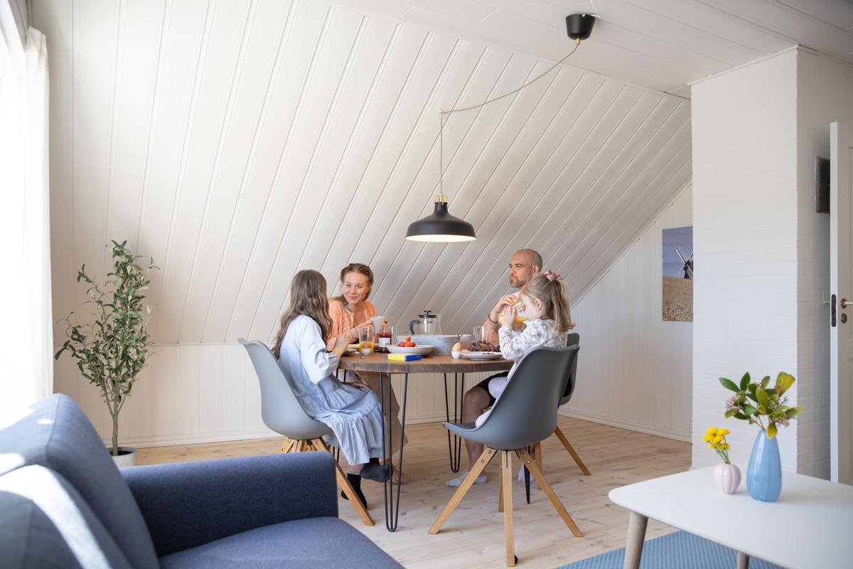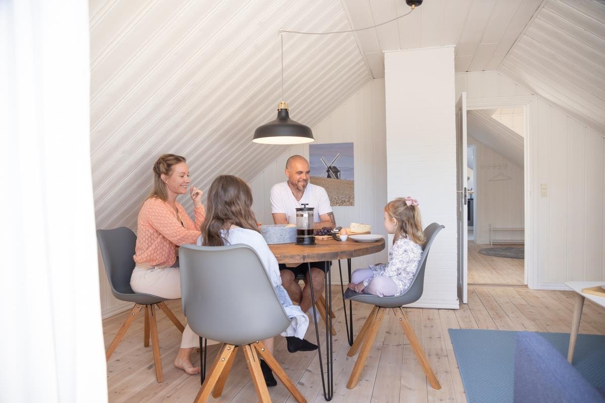 Høloftet er navnet på Hawbakkens charmerende ferielejlighed på 1. sal, der byder på hyggelige skråvægge, men er indrettet med fokus på moderne bekvemmeligheder.